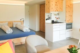 Genießt die gesunde Atmosphäre dieses sorgsam gestalteten Rückzugsorts, wo Nachhaltigkeit auf Komfort trifft. Die 37 m² große Wohnung wurde 2022 frisch renoviert und mit einem besonderen Fokus auf Nachhaltigkeit gestaltet. Das Studio ist der perfekte Rückzugsort für Paare, die die Schönheit der Natur und modernen Komfort suchen.