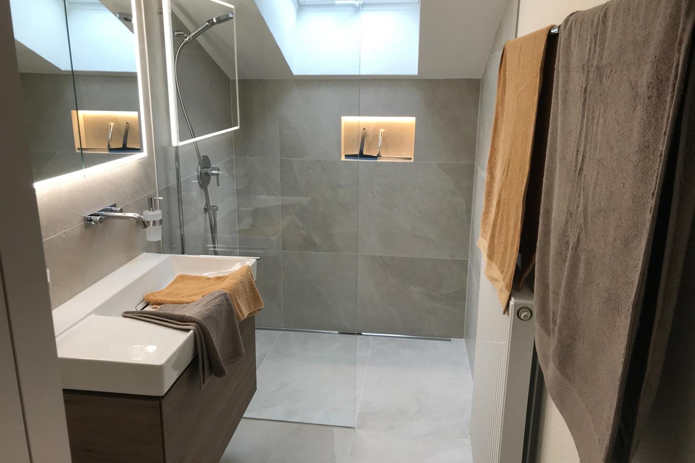 Das Badezimmer verfügt über eine Dusche, Lavabo, Toilette.