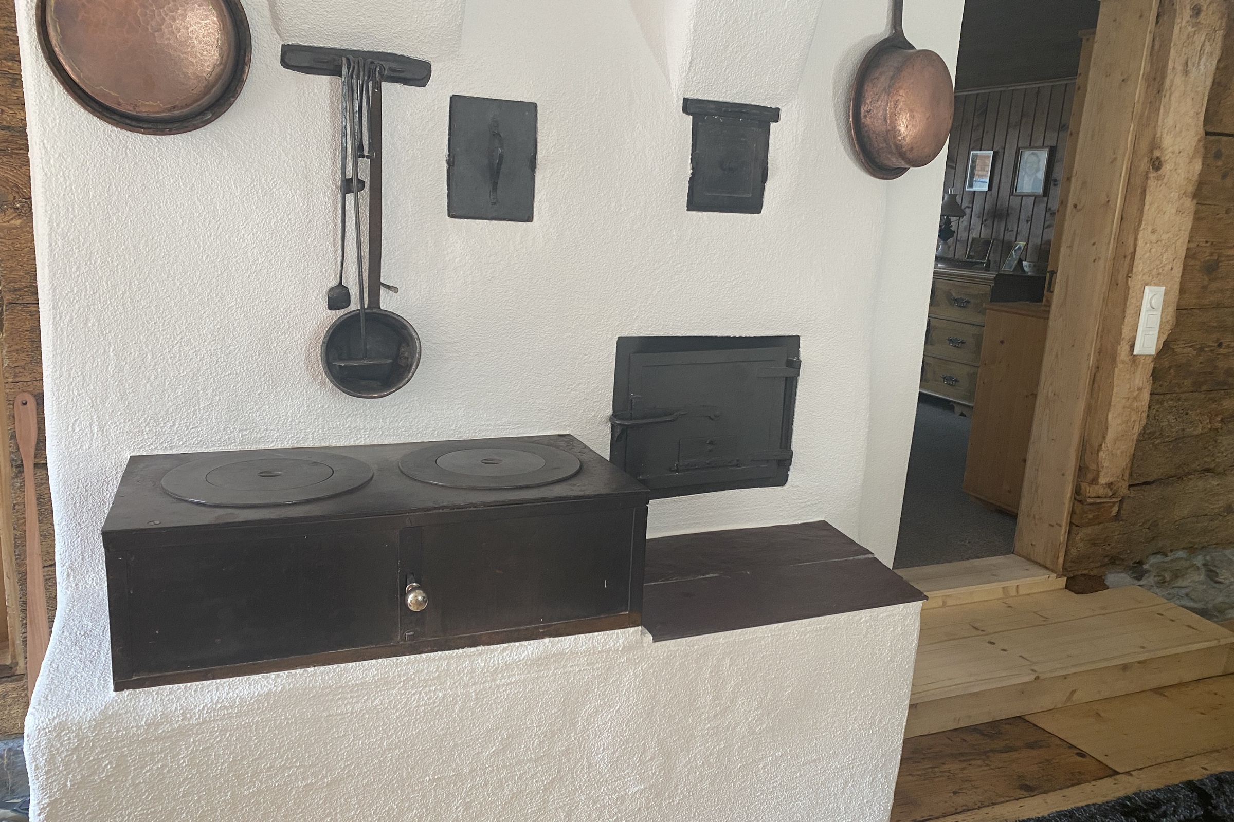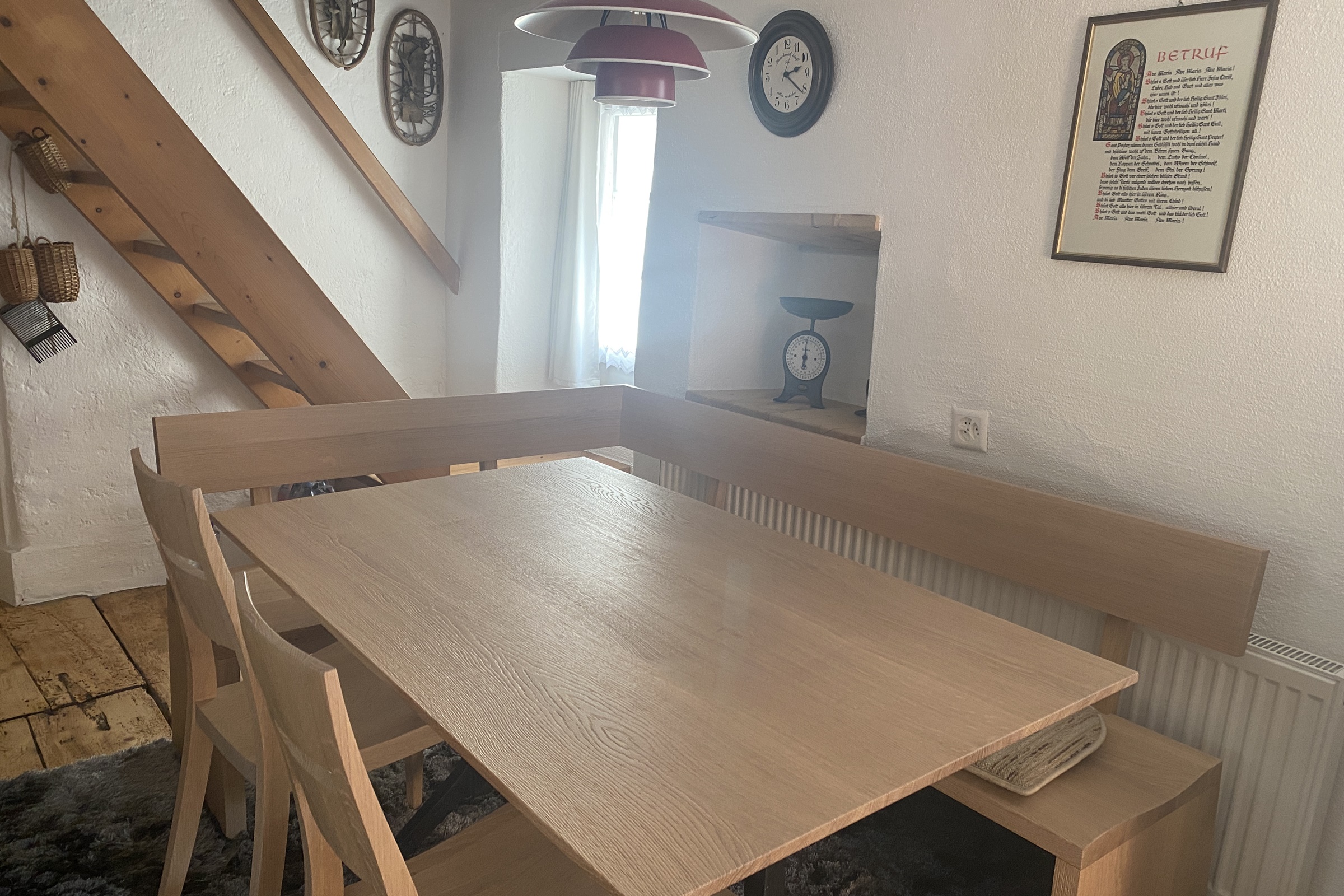 Die Küche mit Essbereich (17m²) ist umfassend ausgestattet und erfüllt alle Anforderungen moderner Gäste. Zur Ausstattung gehören ein Induktionsherd, Backofen, Mikrowelle, Geschirrspüler sowie eine Auswahl an Küchengeräten wie Kaffeemaschine, Wasserkocher, Raclette- und Fondue-Set, Toaster und Mixer. Auch Küchenwäsche ist vorhanden. Inneneinrichtung