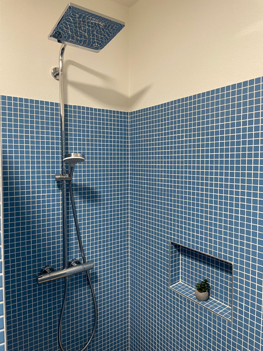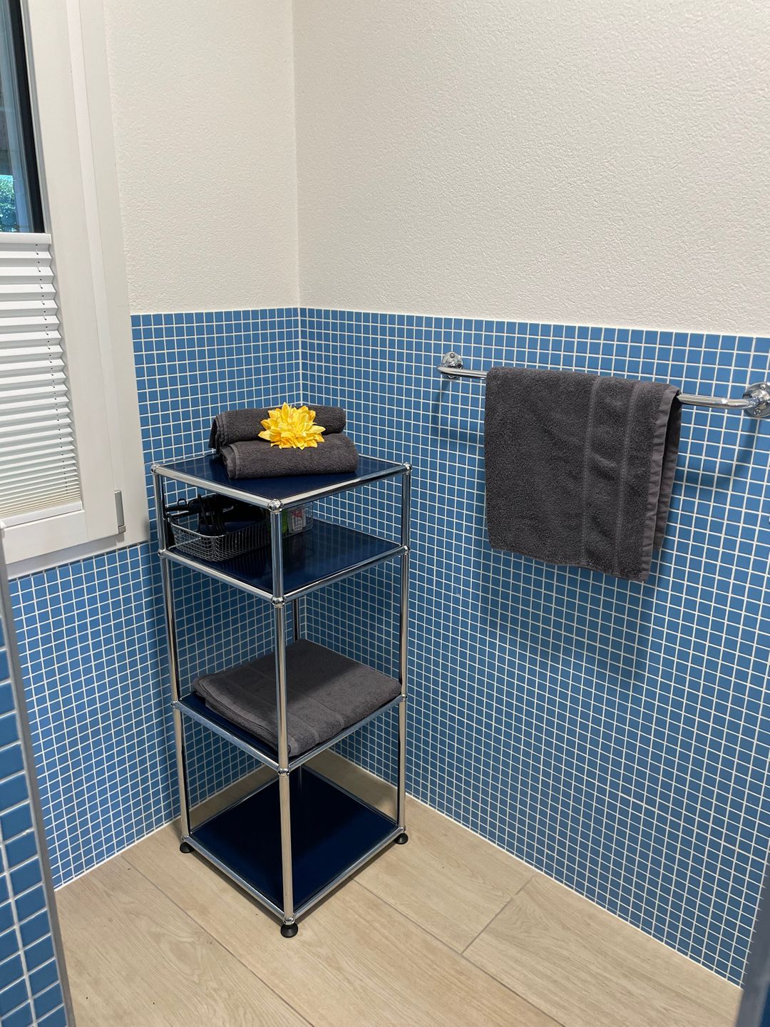 • Badezimmer mit begehbarer Regendusche/WC, Lavabo
