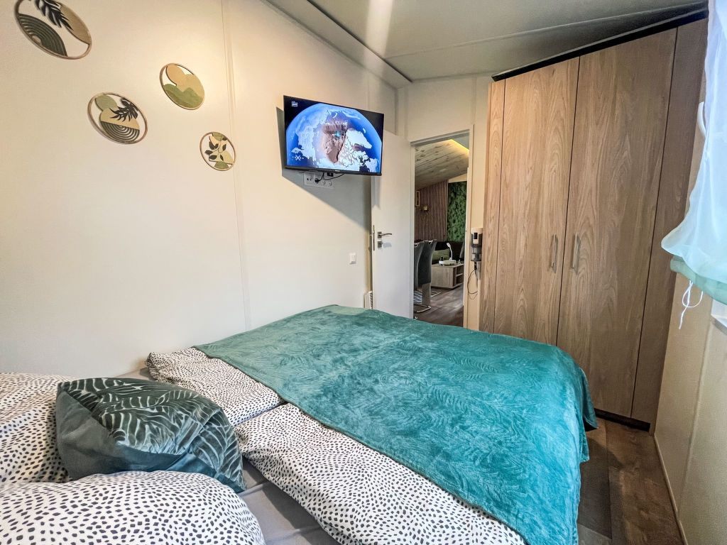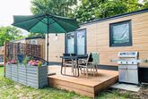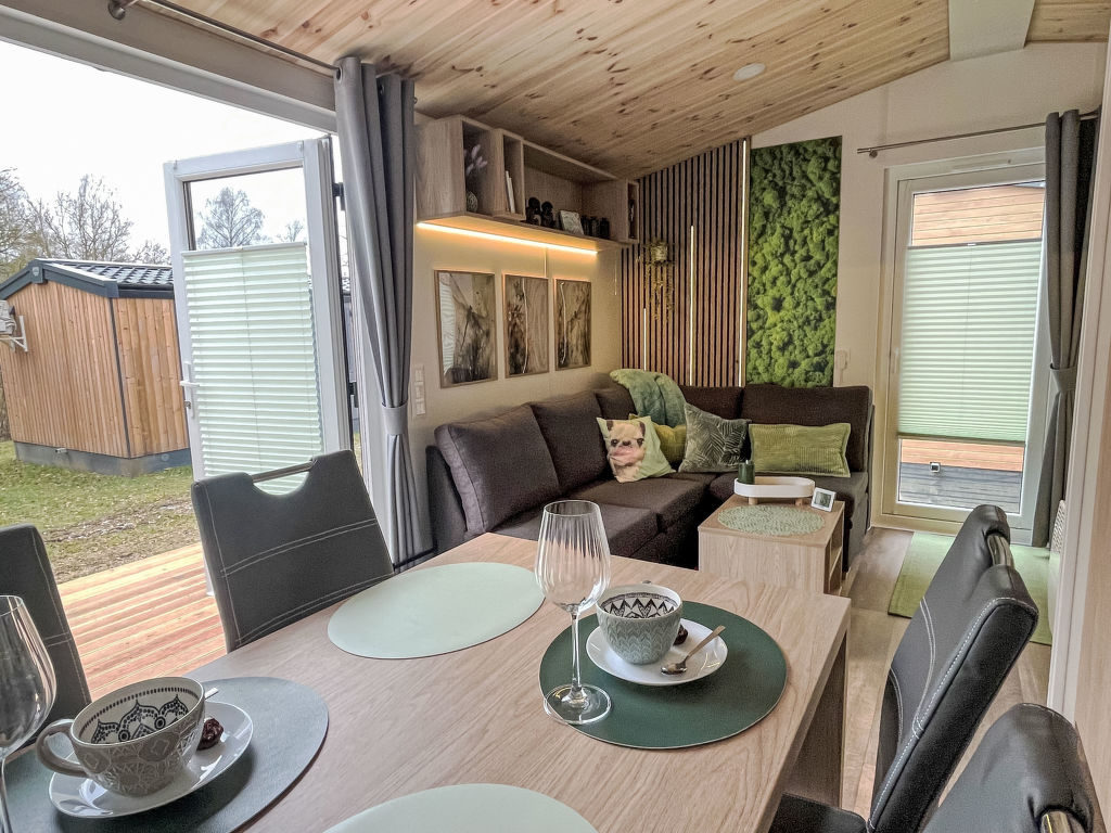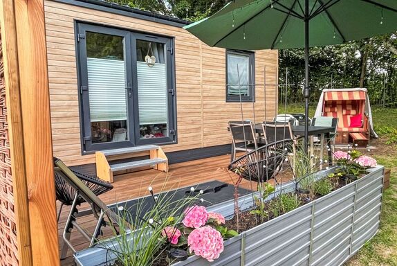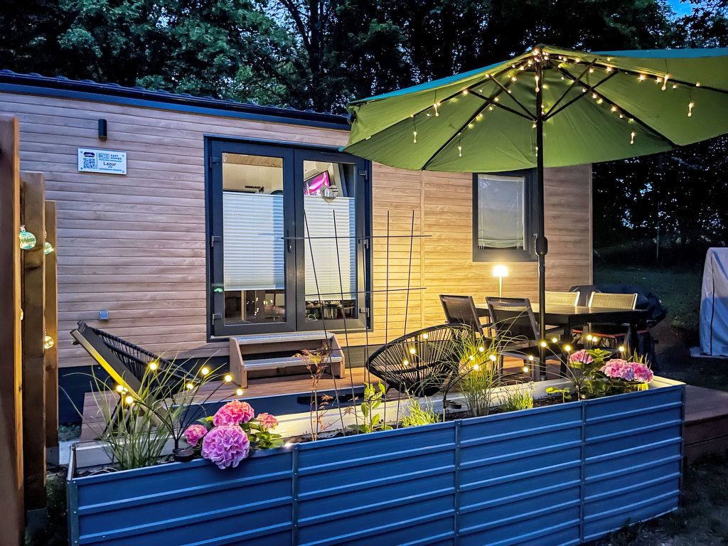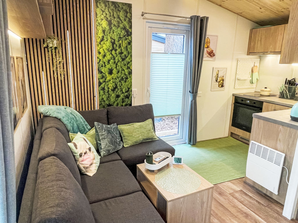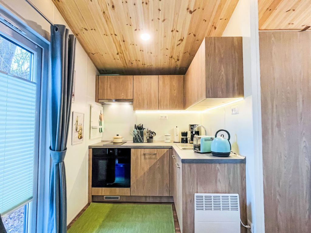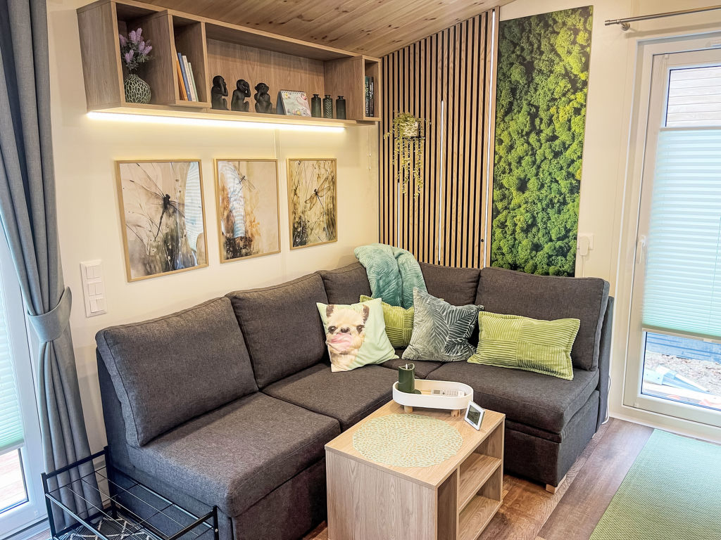 Tiny Haus Tiny Moments, 3-Zimmer-Mobilheim 31 m2. Gemütlich eingerichtet: Wohn-/Esszimmer mit 1 Diwanbett, Esstisch und Sat-TV (Flachbildschirm). Ausgang zur Terrasse. 1 Zimmer mit 1 Doppelbett (160 cm, Länge 200 cm), Sat-TV. 1 Zimmer mit 2 Betten (80 cm, Länge 200 cm), Sat-TV. Kochnische (Backofen, Geschirrspüler, 2 Induktionskochplatten, Toaster, Wasserkocher, elektrische Kaffeemaschine). Dusche/WC. E-Heizung, Klimaanlage. Terrasse. Terrassenmöbel, Gartengrill (mobil). Zur Verfügung: Fliegengitter. Bitte beachten: Nichtraucher-Unterkunft. Hinweis: Die WLAN-Verbindung kann je nach Kapazität eingeschränkt sein.