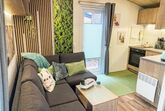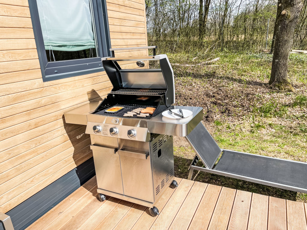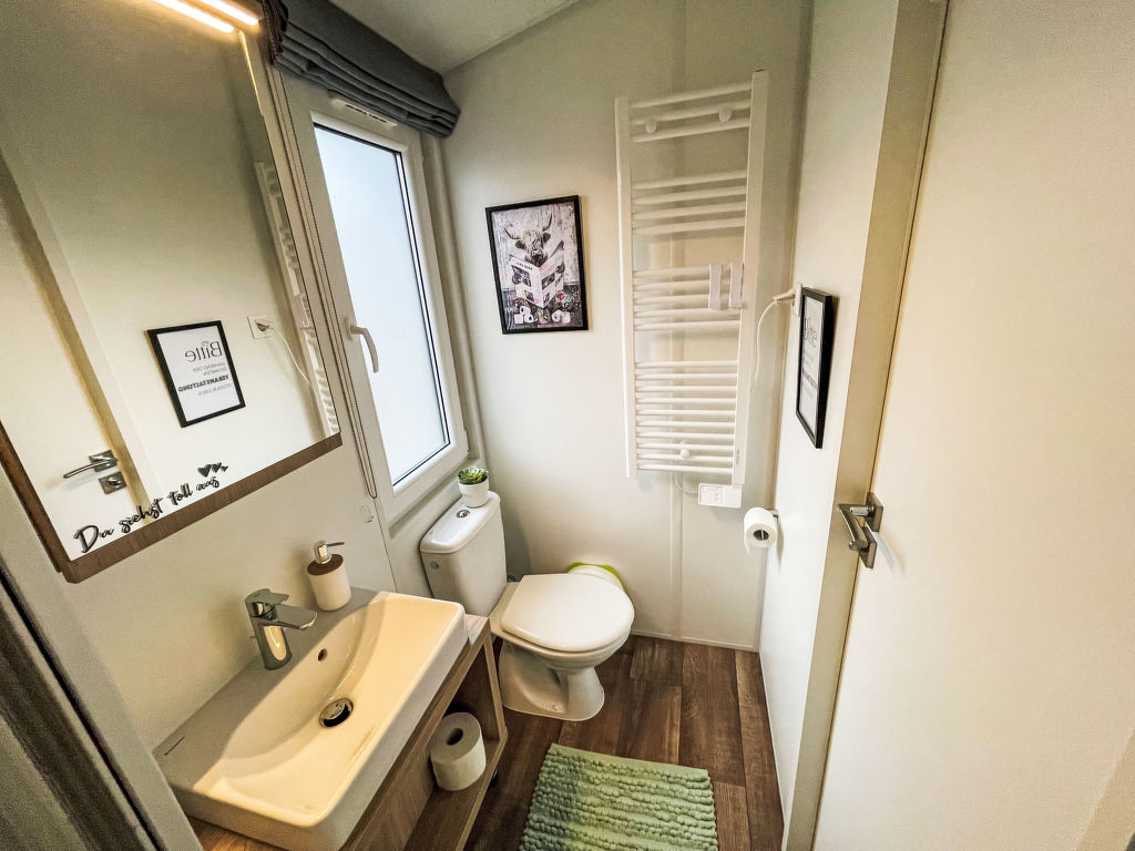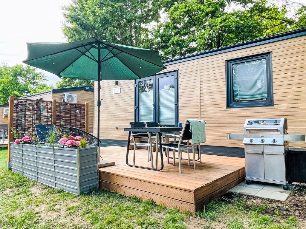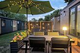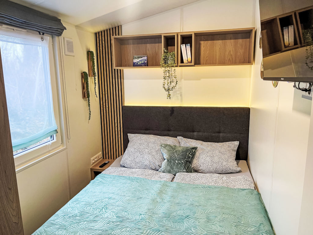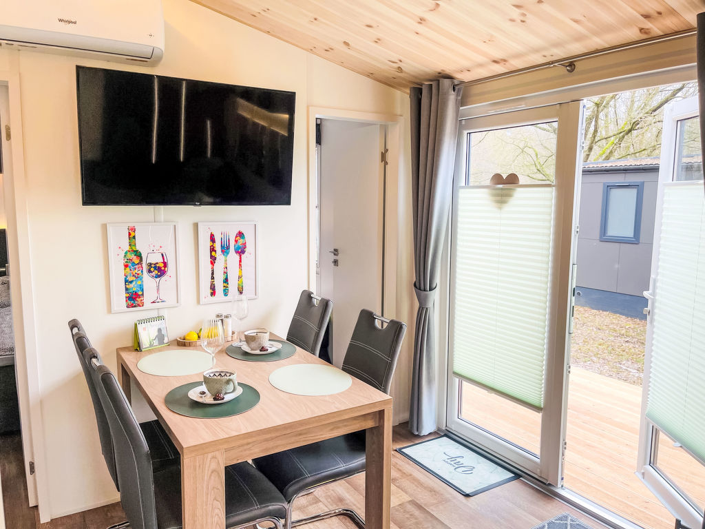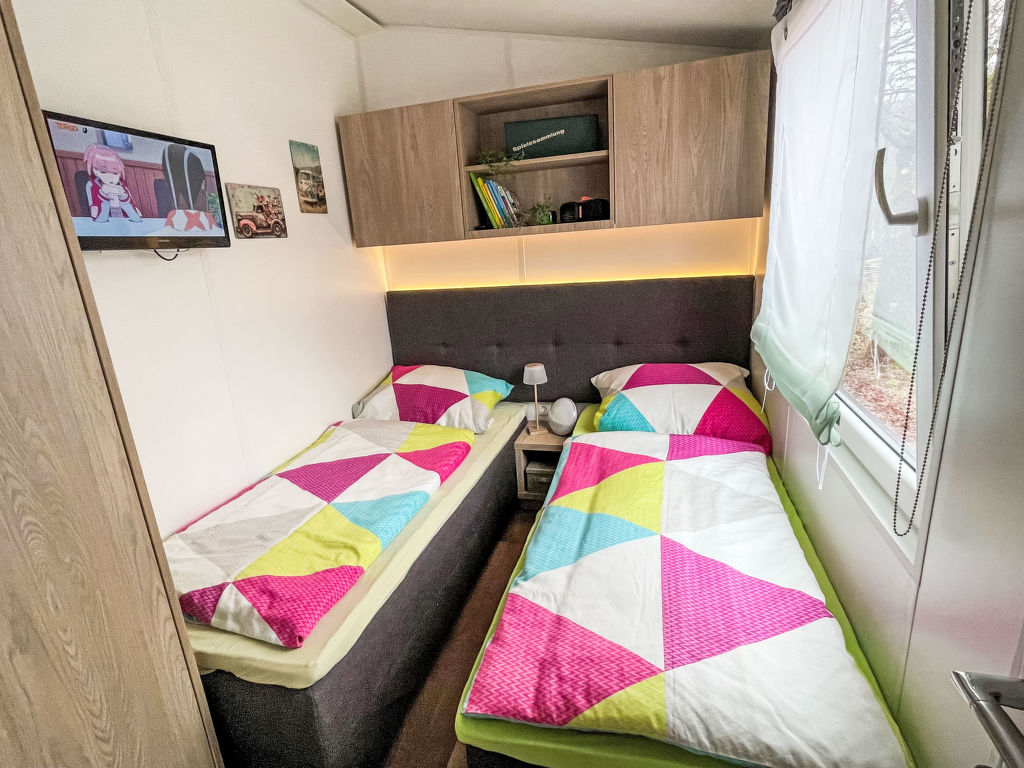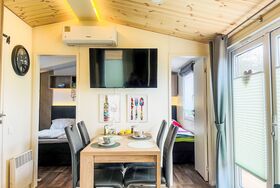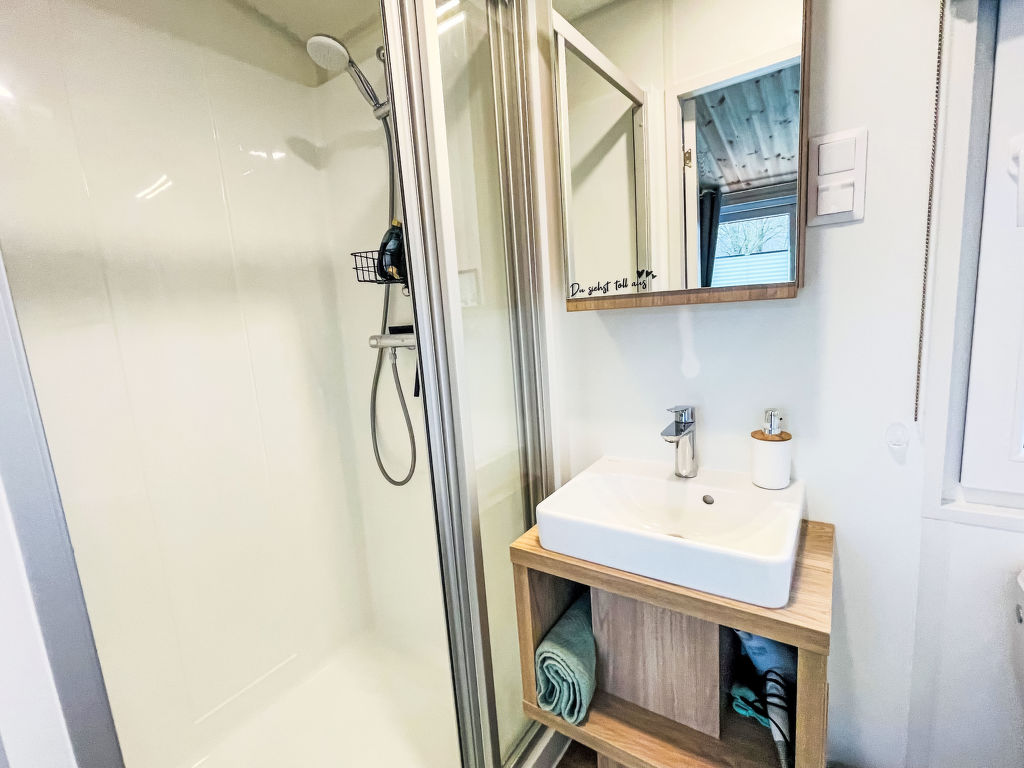 Tiny Haus Tiny Moments, 3-Zimmer-Mobilheim 31 m2. Gemütlich eingerichtet: Wohn-/Esszimmer mit 1 Diwanbett, Esstisch und Sat-TV (Flachbildschirm). Ausgang zur Terrasse. 1 Zimmer mit 1 Doppelbett (160 cm, Länge 200 cm), Sat-TV. 1 Zimmer mit 2 Betten (80 cm, Länge 200 cm), Sat-TV. Kochnische (Backofen, Geschirrspüler, 2 Induktionskochplatten, Toaster, Wasserkocher, elektrische Kaffeemaschine). Dusche/WC. E-Heizung, Klimaanlage. Terrasse. Terrassenmöbel, Gartengrill (mobil). Zur Verfügung: Fliegengitter. Bitte beachten: Nichtraucher-Unterkunft. Hinweis: Die WLAN-Verbindung kann je nach Kapazität eingeschränkt sein.