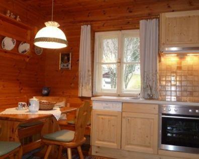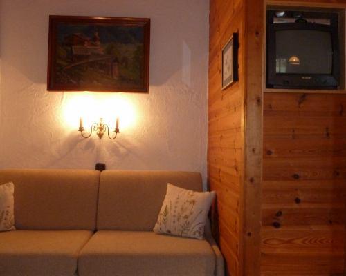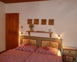 Im ersten Stock des Stammhauses - gemütliche Wohnküche mit Geschirrspüler, einzeln ausziehbarer Doppelcouch, durch eine Tür verbundenes Doppelbettschlafzimmer mit Dusche/WC, Südbalkon mit herrlicher Aussicht