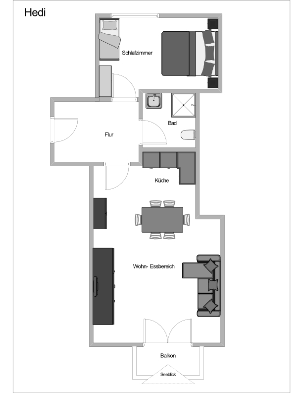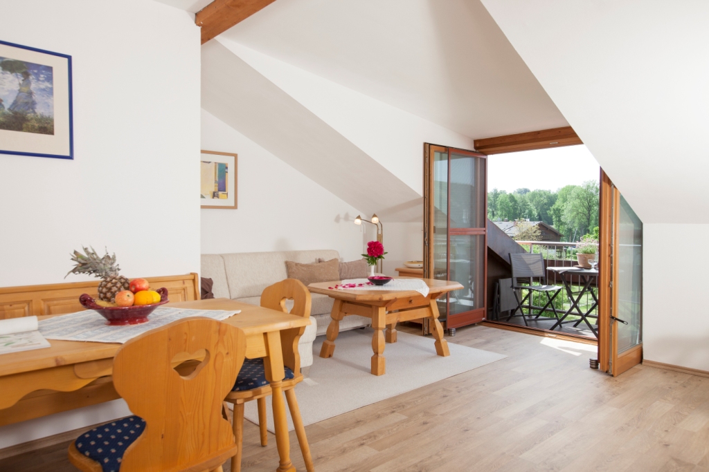 Beschreibung: Bayrisch eingerichtete Ferienwohnung mit ca. 45 qm, 2. Stock, für 2 -3 Personen, großer Balkon zur Südseite mit See- und Bergblick, großzügig ausgestattete Küche mit angrenzendem Wohn-/Essbereich. Badezimmer mit Dusche/WC. Schlafzimmer mit Doppelbett. Die räumliche Aufteilung der Ferienwohnung können Sie dem Grundriss entnehmen.