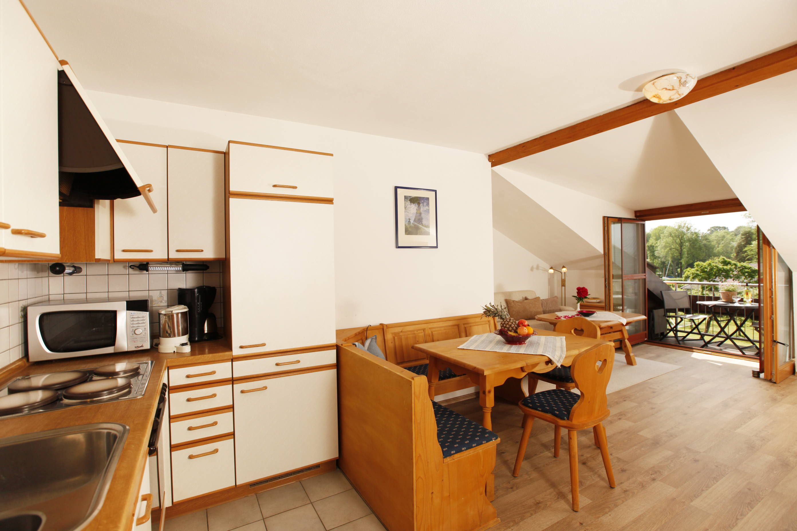 Ausstattung: Fernseher, W-LAN, Radio, Couch (ausziehbare Schlafcouch), Föhn, Kosmetikspiegel, Handtücher und Bettwäsche, Spülmaschine, Wertschließfach. Balkone sind mit Tisch und Stühlen ausgestattet. PKW-Stellplätze stehen direkt vor dem Wohnhaus zur Verfügung. Fahrräder und Sportgeräte können im Carport regengeschützt untergestellt werden.