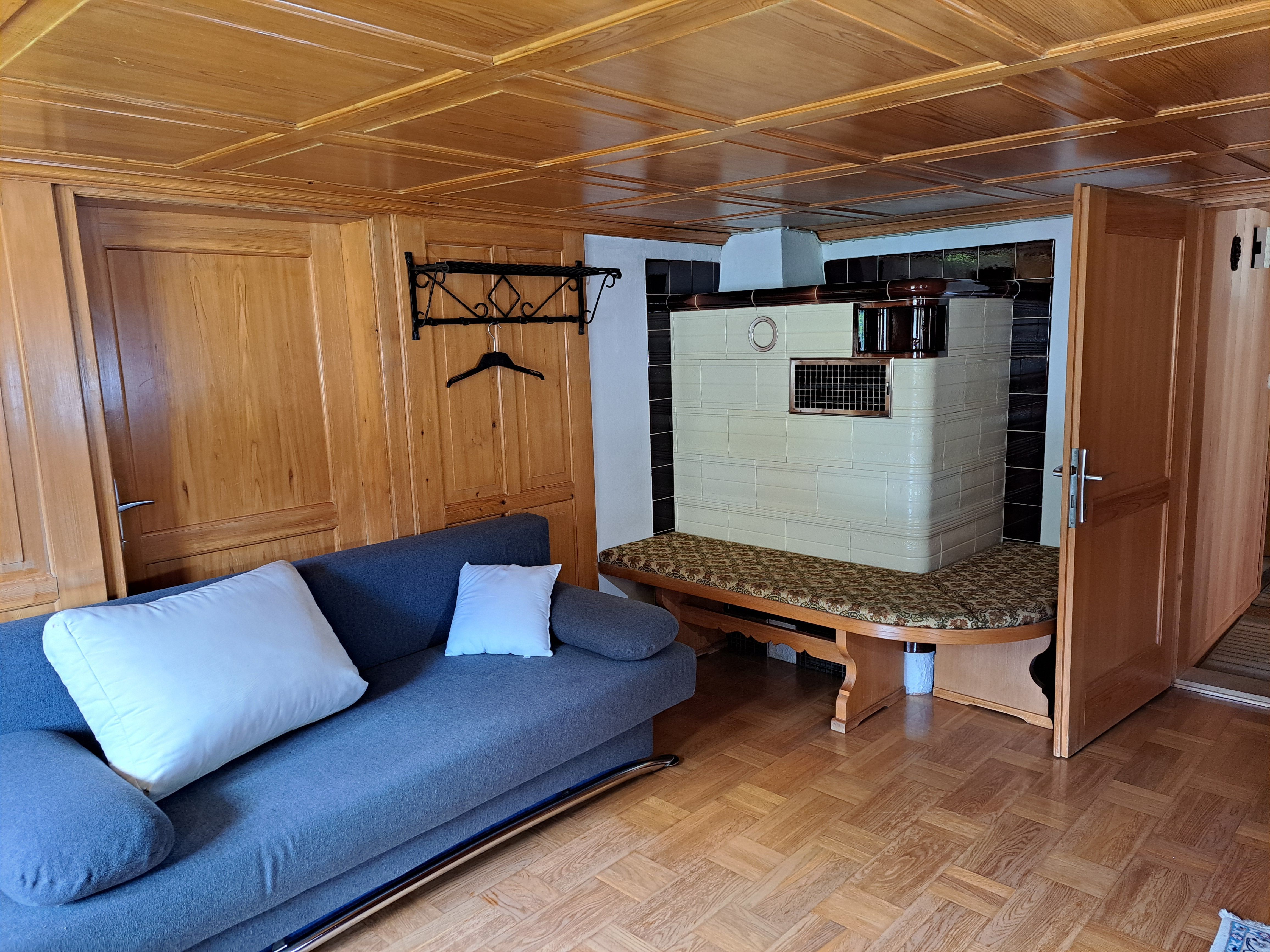 Der traditionelle Kachelofen sorgt für eine gemütliche Atmosphäre ideal für entspannte Abende nach einem Tag in der Natur.