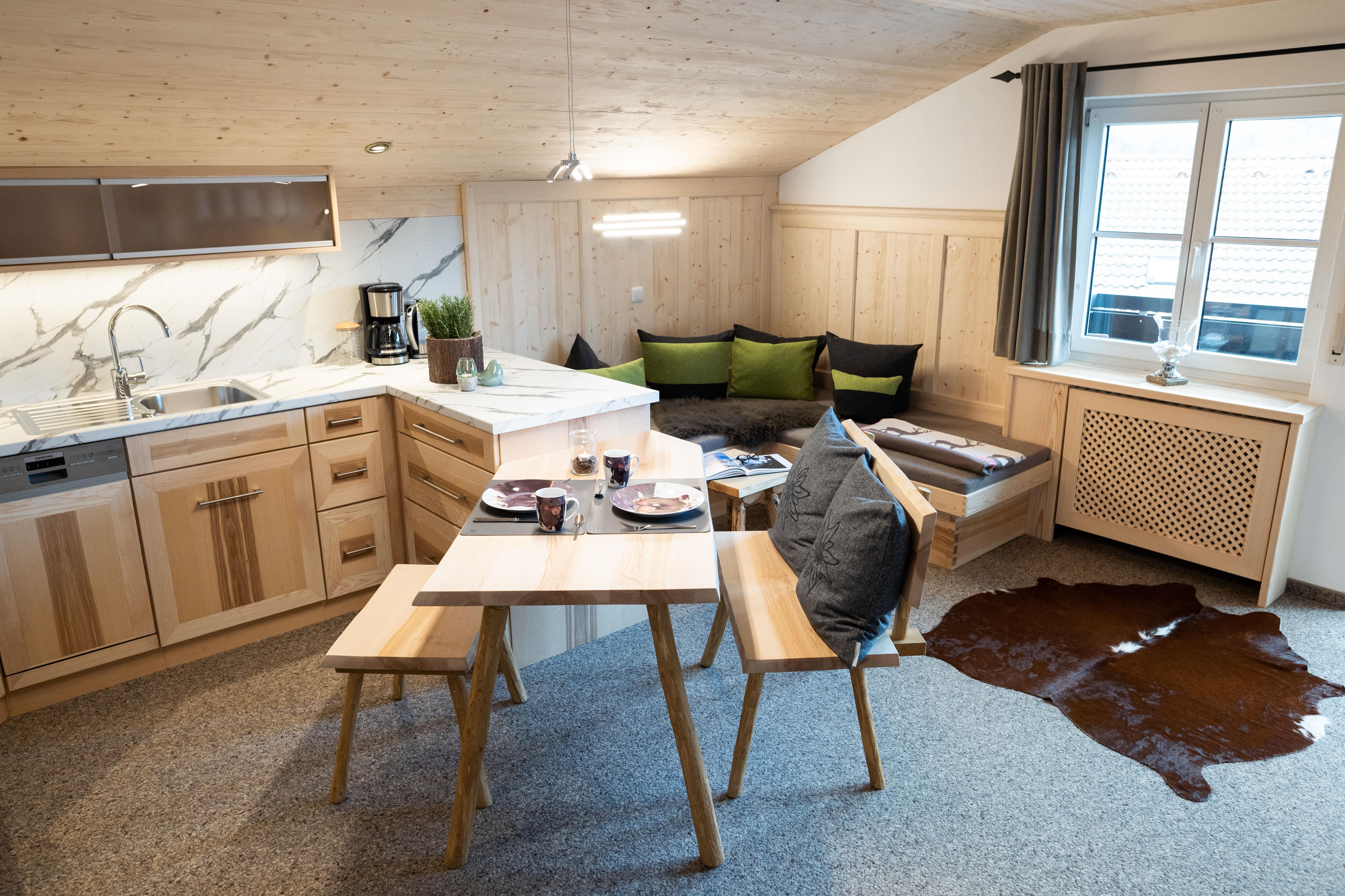 Die Ferienwohnung Entschenkopf für 2 Personen ist mit 70 qm und einer eigenen Sauna die Luxus-Wohnung in unserer Pension Hartmann. In alpenländisch-modernem Stil eingerichtet bietet Sie allen Komfort! Ein Flat-Screen-TV ist ebenso selbstverständlich wie eine voll ausgestattete Küche mit Spülmaschine und Ceran-Kochfeld.