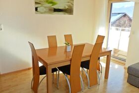 Vollausgestattete Ferienwohnung für bis zu 4 Personen mit 2 Schlafzimmern, Wohnzimmer mit Esstisch und Sat-TV, Kochnische mit gut ausgestatteter Küche. Bettwäsche und Handtücher werden ohne zusätzliche Berechnung zur Verfügung gestellt. Der südseitig gelegene Balkon ist mit Terassenmöbeln ausgestattet. Auf Wunsch können wir Ihnen auch ein Kinderbett zur Verfügung stellen.
