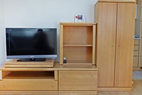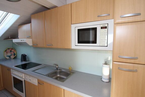 • Wohnzimmer mit Esstisch und Sat-TV, Kochnische mit gut ausgestatteter Küche