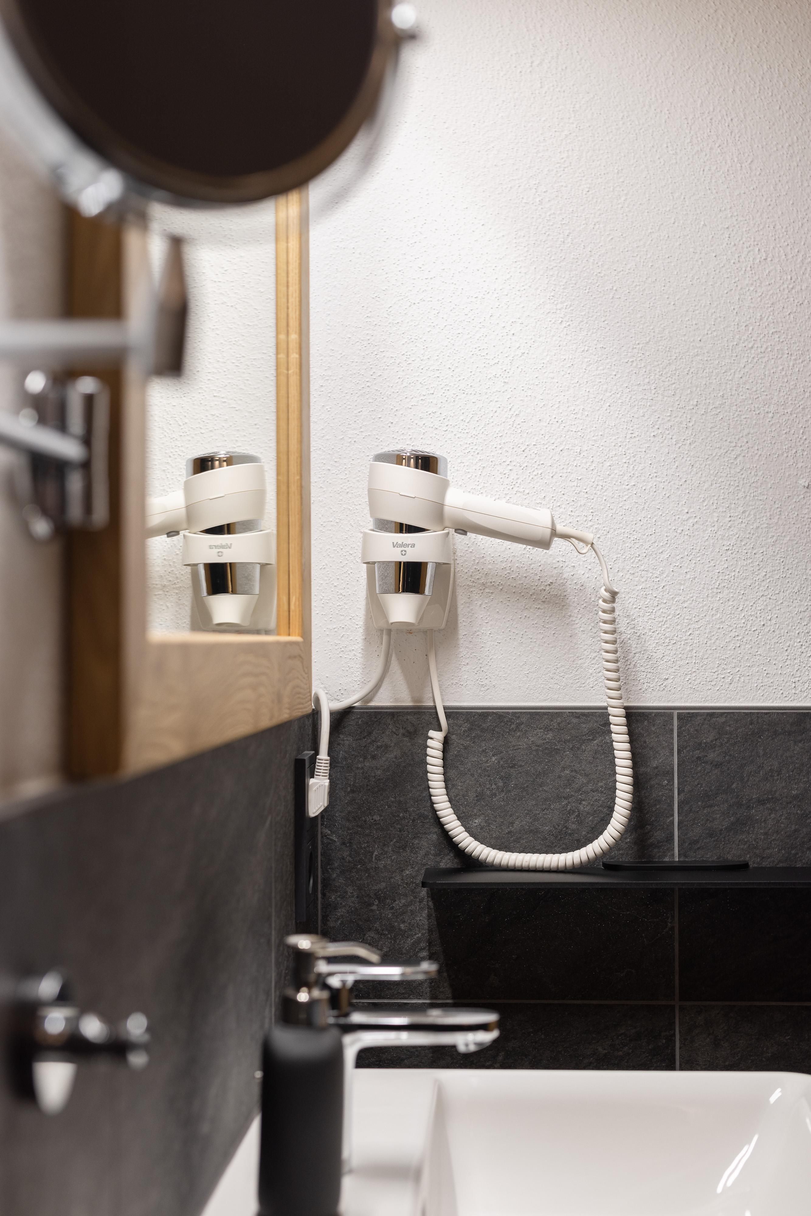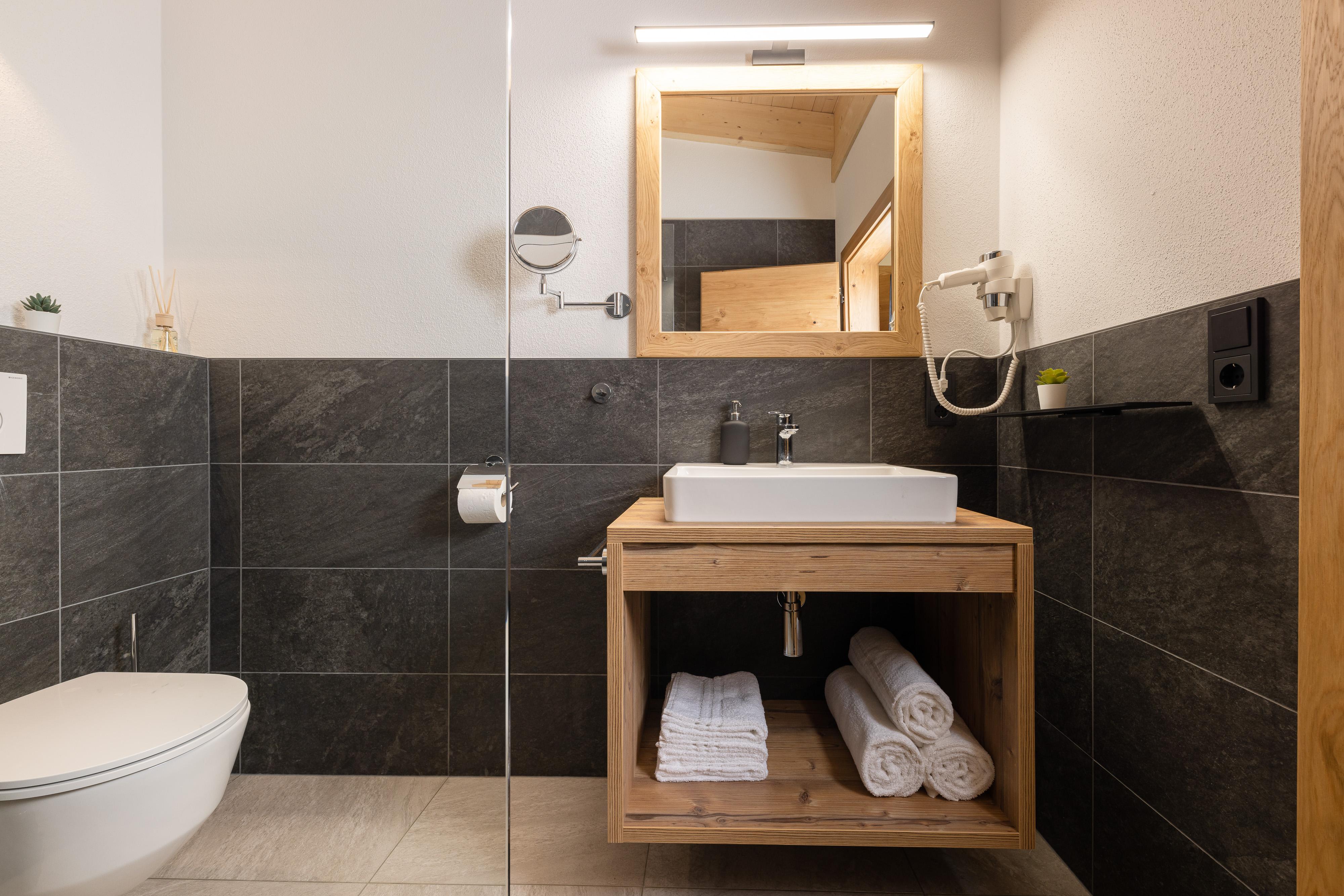 • Jedes Schlafzimmer besitzt ein eigenes Badezimmer (Zugang vom Zimmer) mit barrierefreier Dusche, Waschbecken, Föhn, Handtuchtrockner und einem WC.