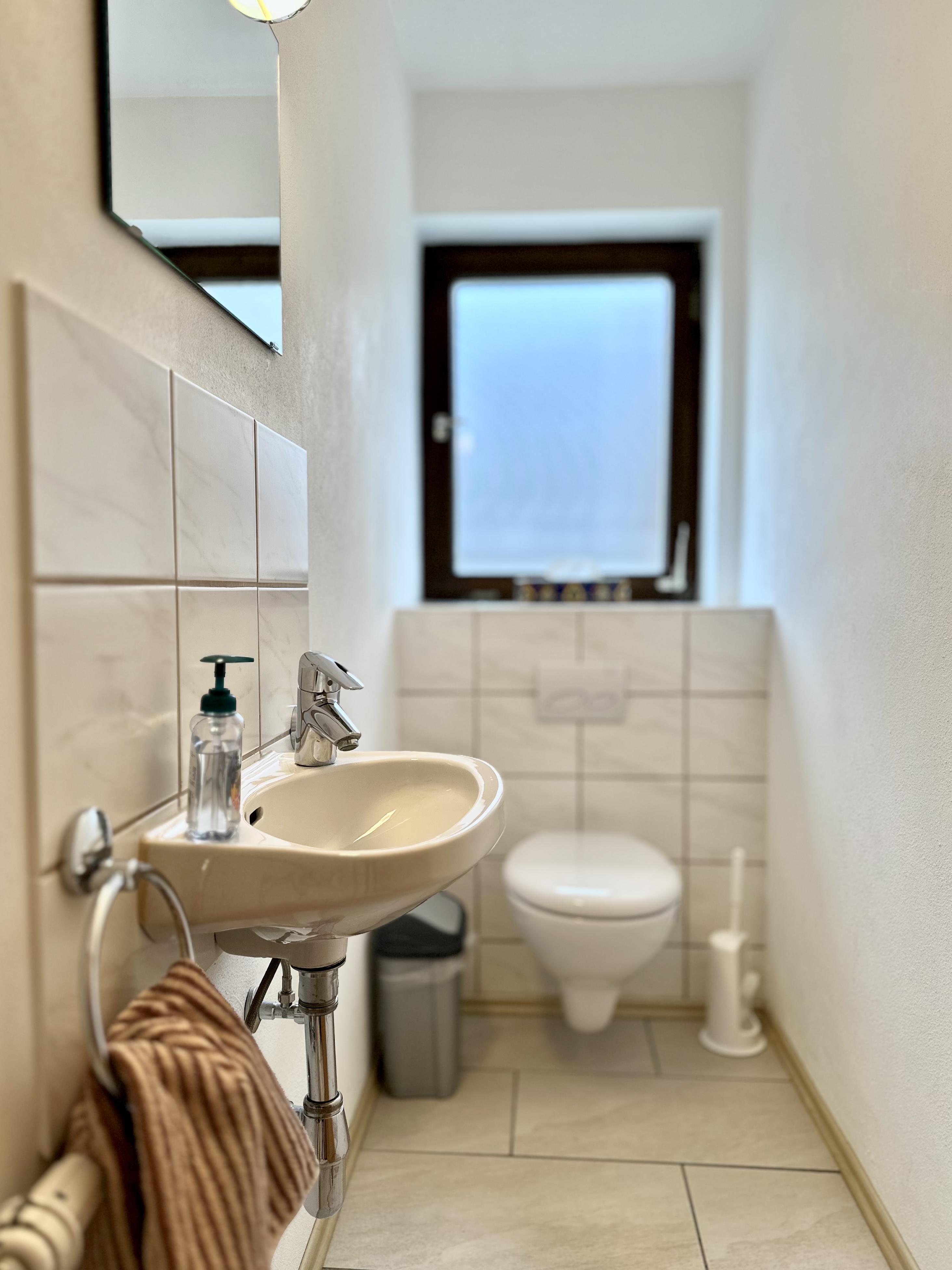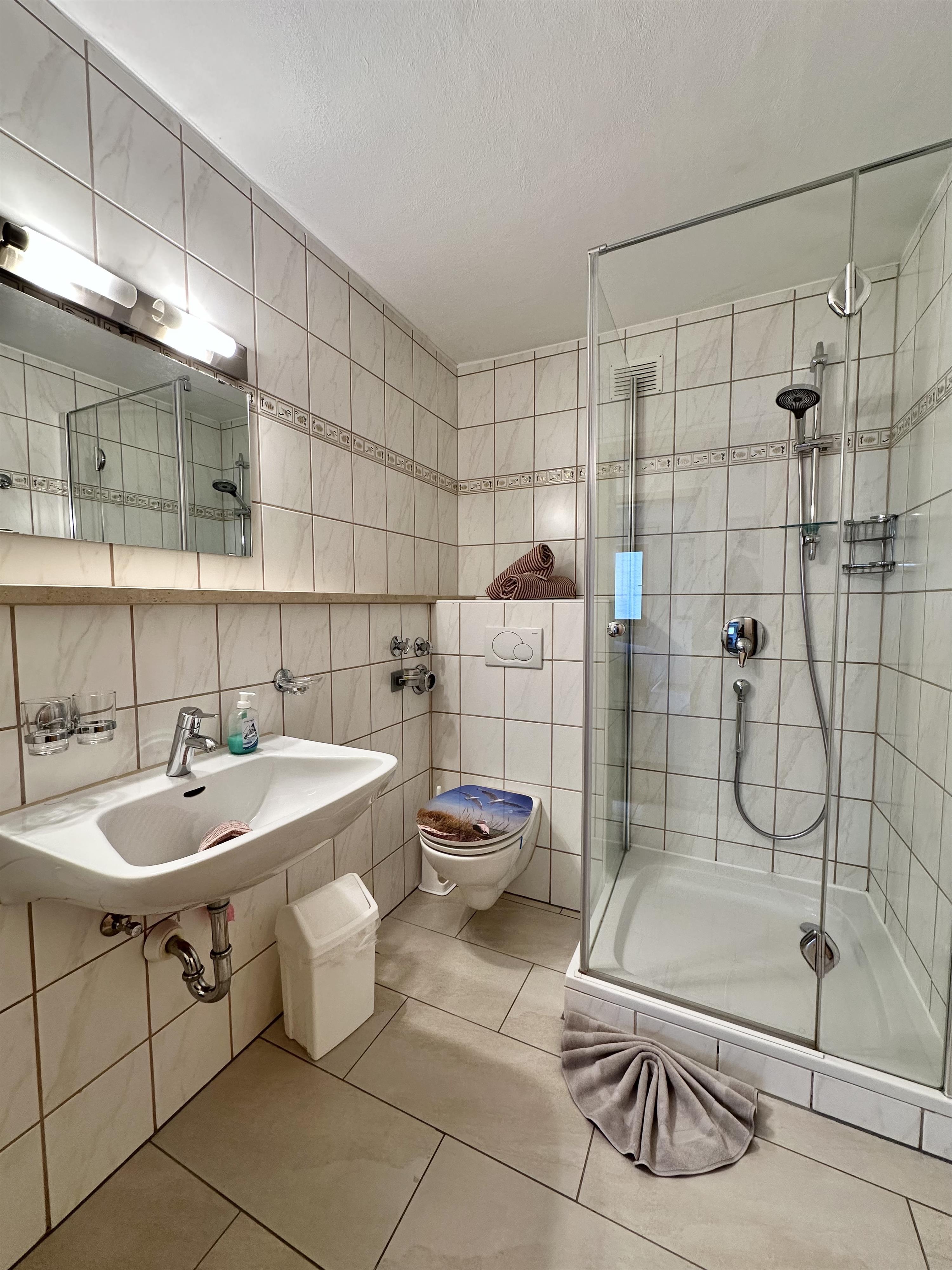 Das Badezimmer verfügt über eine Dusche, ein Waschbecken und eine Toilette. Zusätzlich steht eine getrennte Toilette mit Waschbecken zur Verfügung.