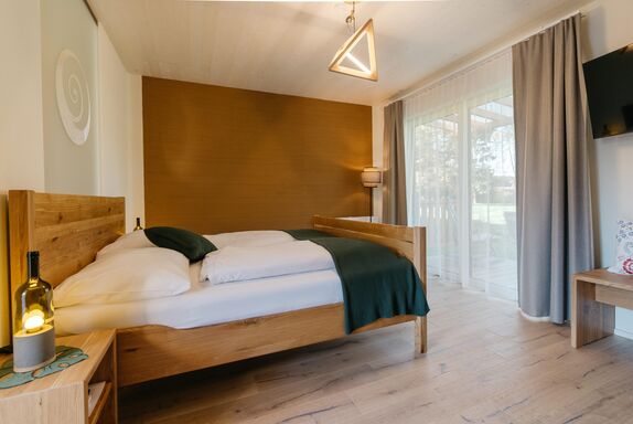 Durch die Balkontür können Gäste einen wunderbaren Blick auf den Garten und das Biotop genießen. Das Zimmer verfügt auch über eine eigene Terrasse mit Sitzmöglichkeiten, einer Lounge mit Tisch sowie Annehmlichkeiten wie Fernseher und WLAN-Zugang für zusätzlichen Komfort und Unterhaltung.