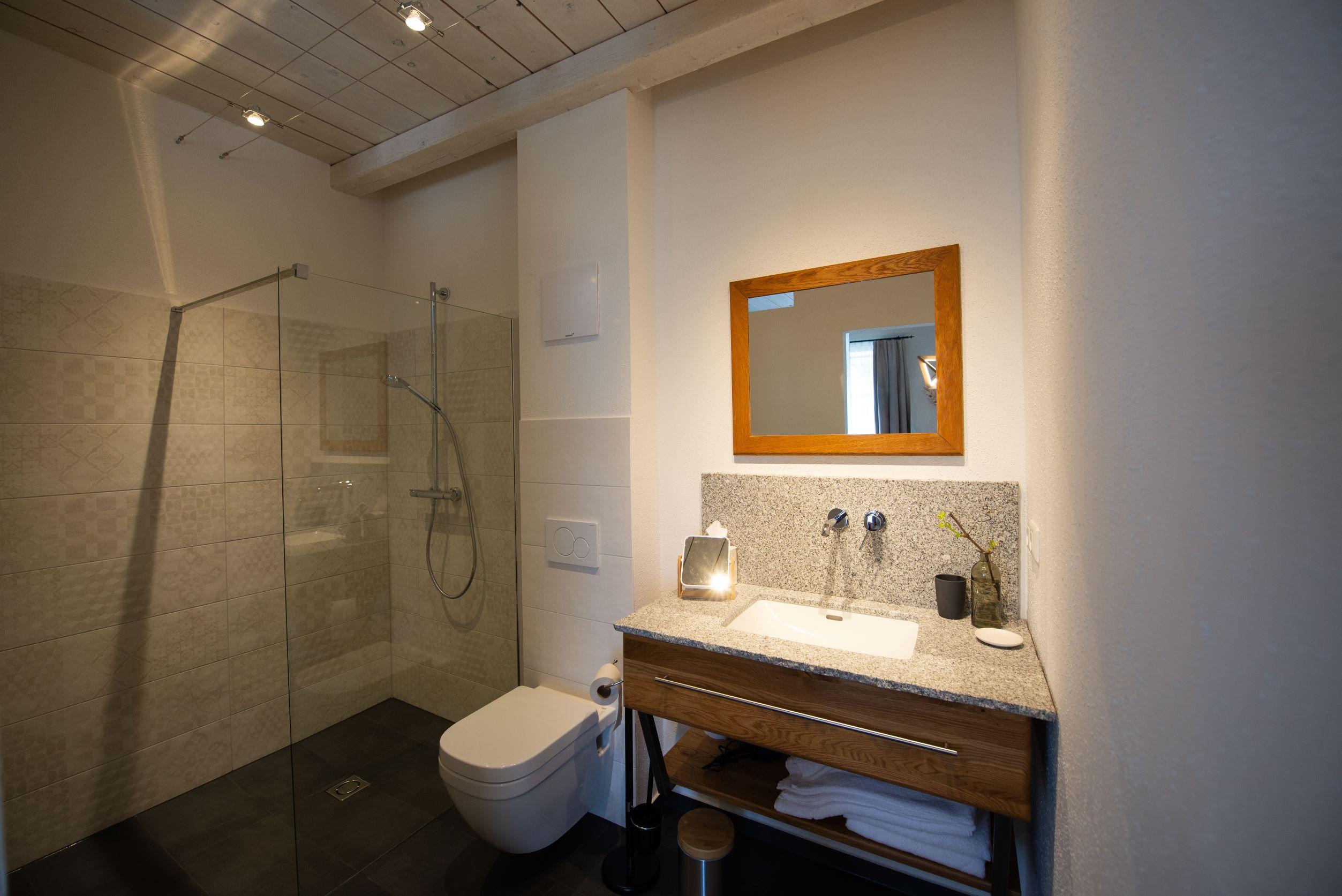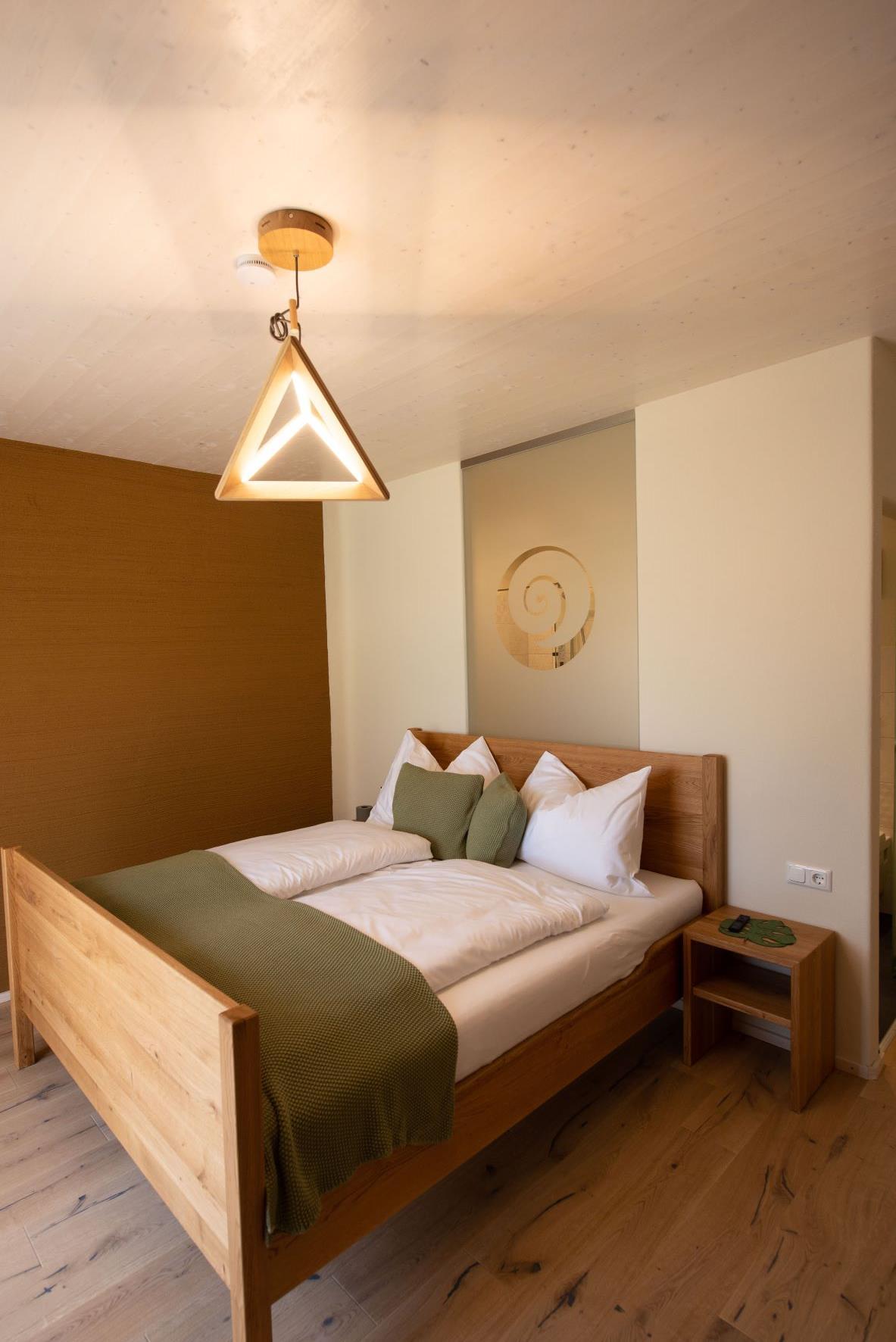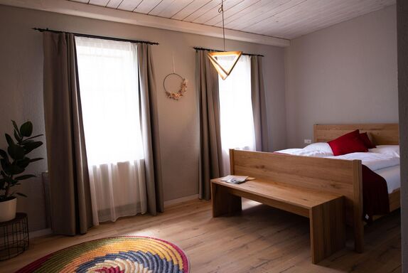 Das Naturzimmer Abendlicht bietet ein gemütliches Doppelzimmer mit einem separaten Bad, bestehend aus Dusche und WC. Die Betten sind aus hochwertigem Vollholz, speziell Eiche gefertigt, was für eine natürliche und warme Atmosphäre sorgt. Die Böden sind ebenfalls aus Eiche Naturboden gefertigt, was das Zimmer mit einem authentischen Ambiente ausstattet. Lehmputz und andere Naturmaterialien tragen zur gesunden Raumluft bei und unterstreichen den ökologischen Ansatz des Zimmers.