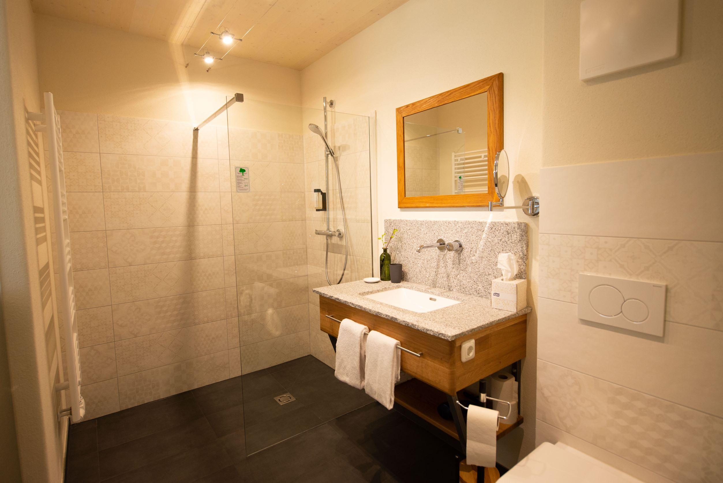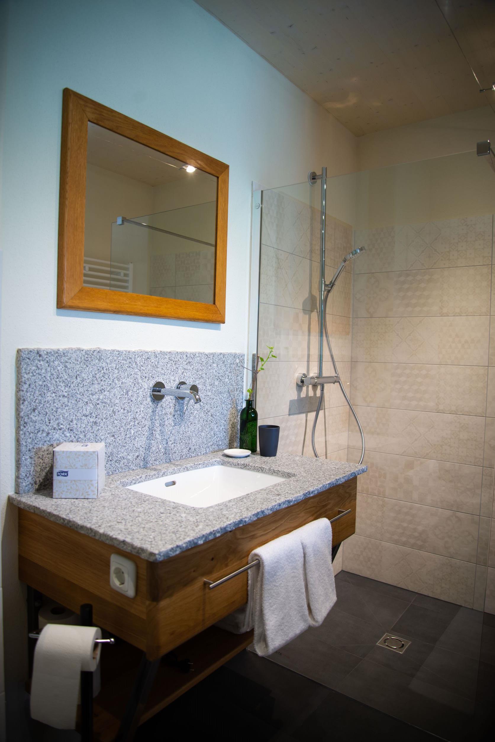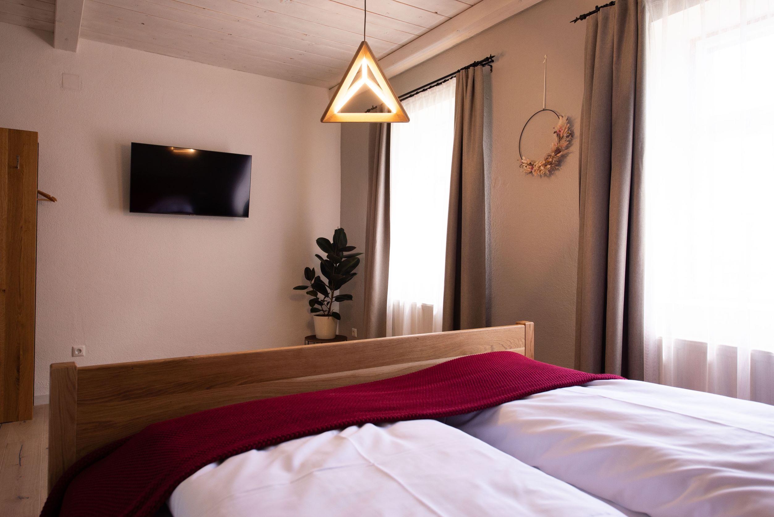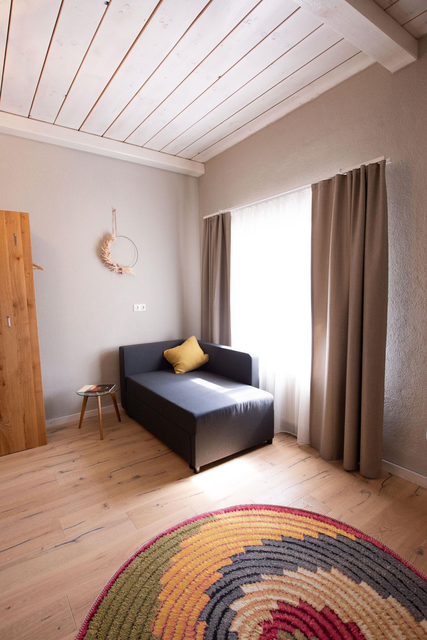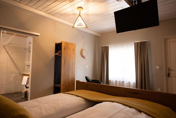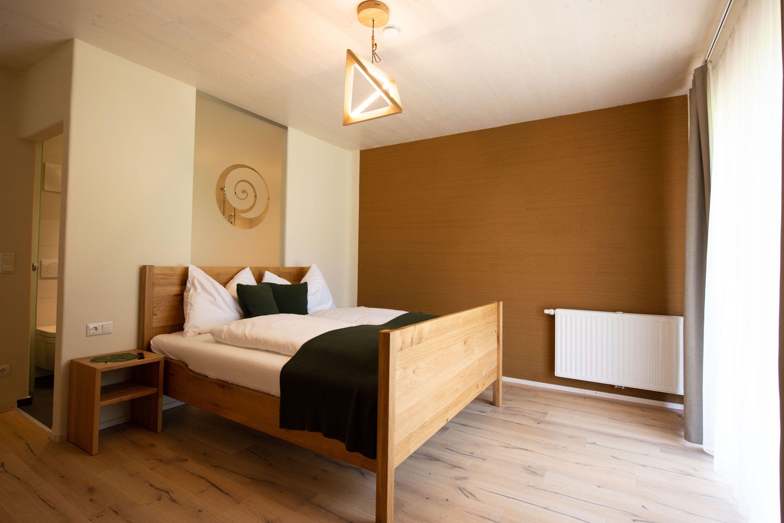 Das Naturzimmer Sonnentanz bietet ein gemütliches Doppelzimmer mit einem separaten Bad, bestehend aus Dusche und WC. Die Betten sind aus hochwertigem Vollholz, speziell Eiche gefertigt, was für eine natürliche und warme Atmosphäre sorgt. Die Böden sind ebenfalls aus Eiche Naturboden gefertigt, was das Zimmer mit einem authentischen Ambiente ausstattet. Lehmputz und andere Naturmaterialien tragen zur gesunden Raumluft bei und unterstreichen den ökologischen Ansatz des Zimmers.