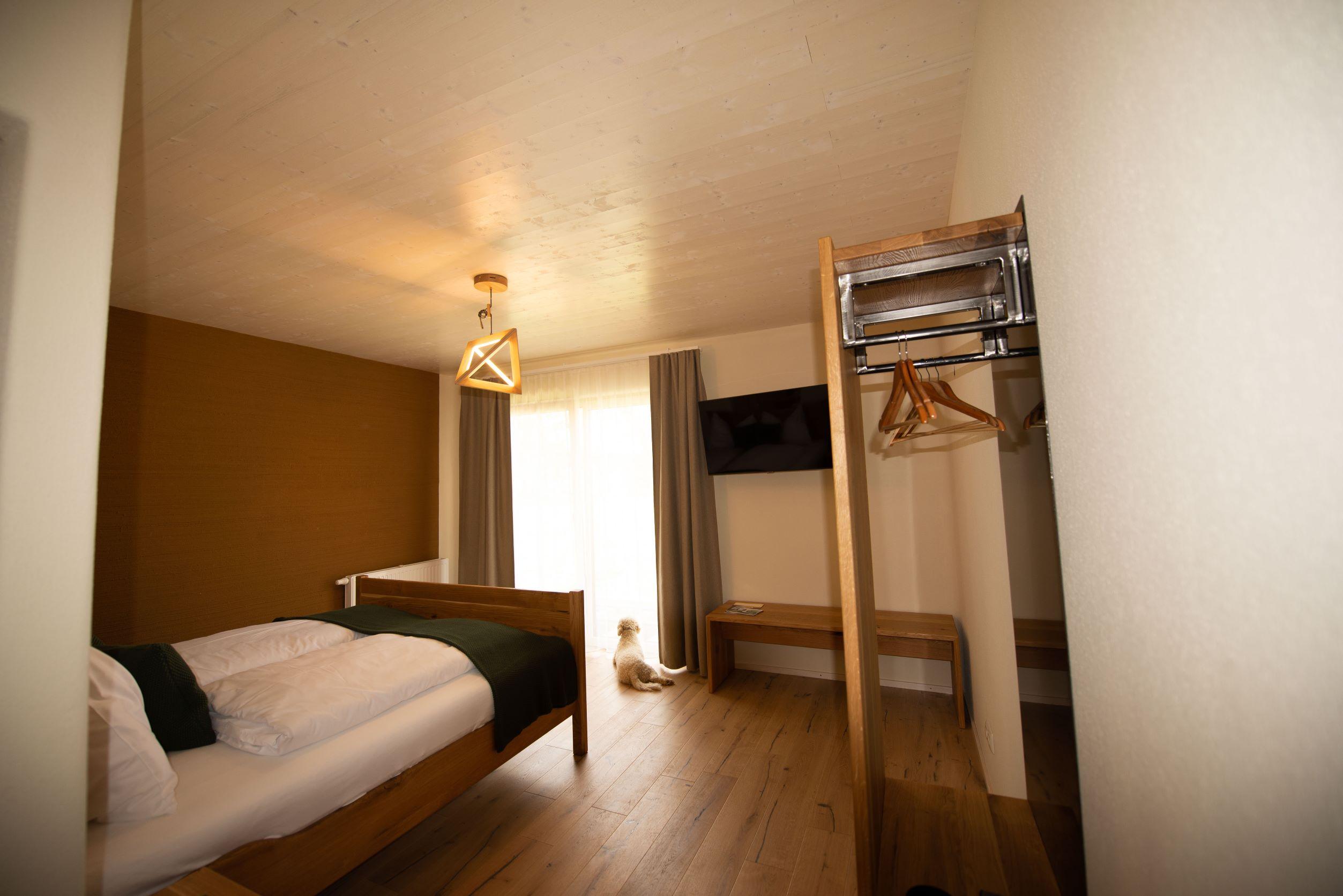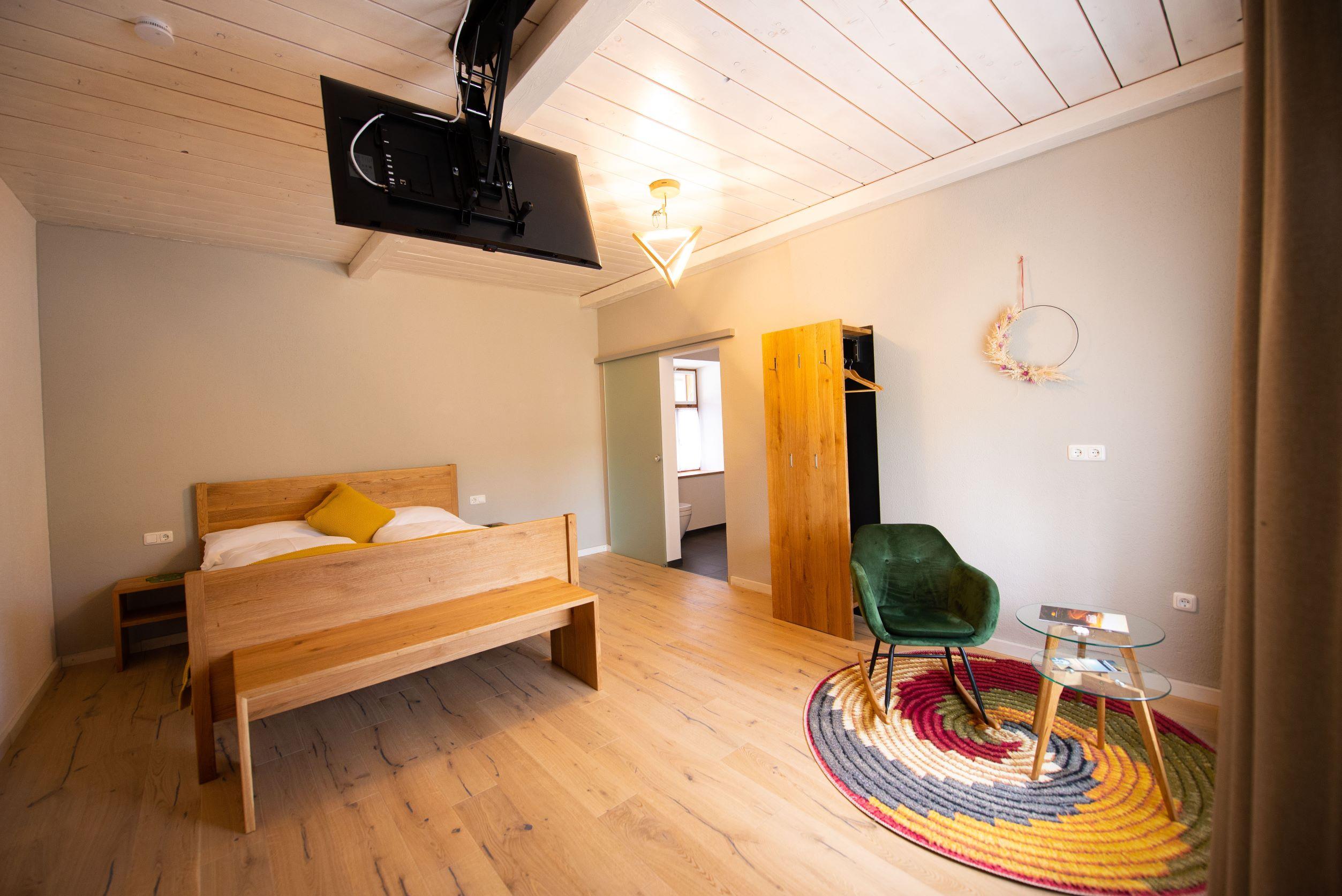 Zusätzlich verfügt das Zimmer über eine eigene Terrasse, auf der Gäste die Natur genießen können. Dort finden sich Sitzmöglichkeiten sowie eine bequeme Liege mit einem Tisch, perfekt für entspannte Momente im Freien. Im Zimmer selbst gibt es zudem einen Fernseher und WLAN-Zugang, um den Gästen Komfort und Unterhaltung zu bieten.