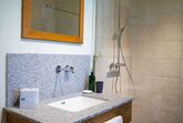 Das Naturzimmer Tief verwurzelt ist ein Doppelzimmer mit einem separaten Bad, das eine Dusche und eine Toilette umfasst. Die Betten sind aus hochwertigem Vollholz, speziell Eiche gefertigt, was eine natürliche und gemütliche Atmosphäre schafft. Der Boden besteht ebenfalls aus Eiche-Naturholz, was das ökologische Ambiente des Zimmers unterstreicht. Mit Lehmputz und anderen Naturmaterialien fördert das Zimmer eine gesunde Raumluft.