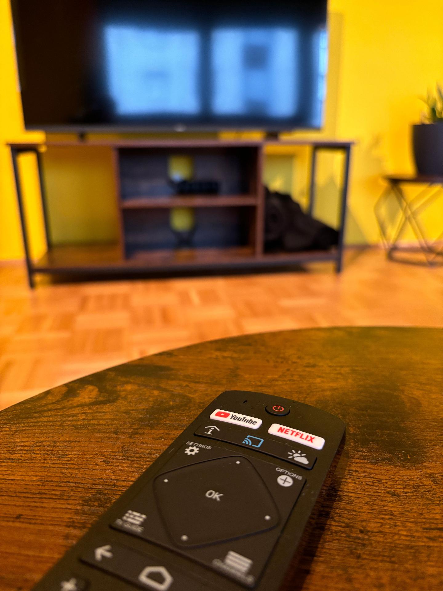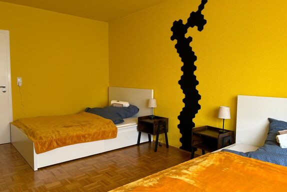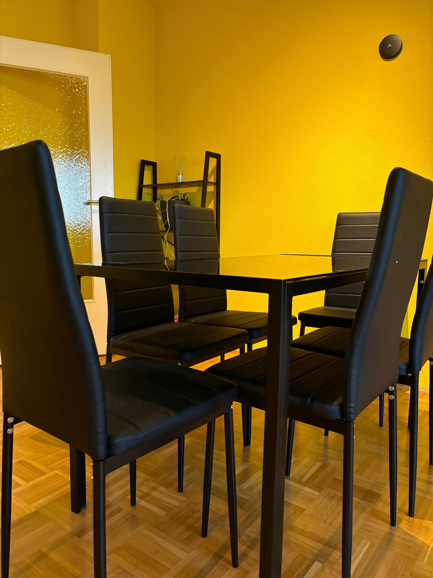 Extravagante gelbe Wände mit moderne Fußbodenbelag; diese schöne Wohnung besteht aus 2 separaten Schlafzimmern mit 4 gemütlichen Betten, ein Wohnzimmer mit Esstisch, mit einem großen Ecksofa mit Schlaffunktion, einer voll ausgestatteten Küche und einem gepflegten Bad. SmartTV und Wifi sind für Sie verfügbar. Durch die großen Fenster wirkt die ganze Wohnung hell und frisch. Auf dem Balkon können Sie Ihre Kaffee genießen oder den Abend ausklingen lassen. Alle notwendigen Einrichtungen sind vorhanden, so dass Sie sich um nichts kümmern müssen. Hier können Sie sich auch in der Ferne wie Zuhause fühlen! Bringen Sie einfach Ihr Gepäck herein!