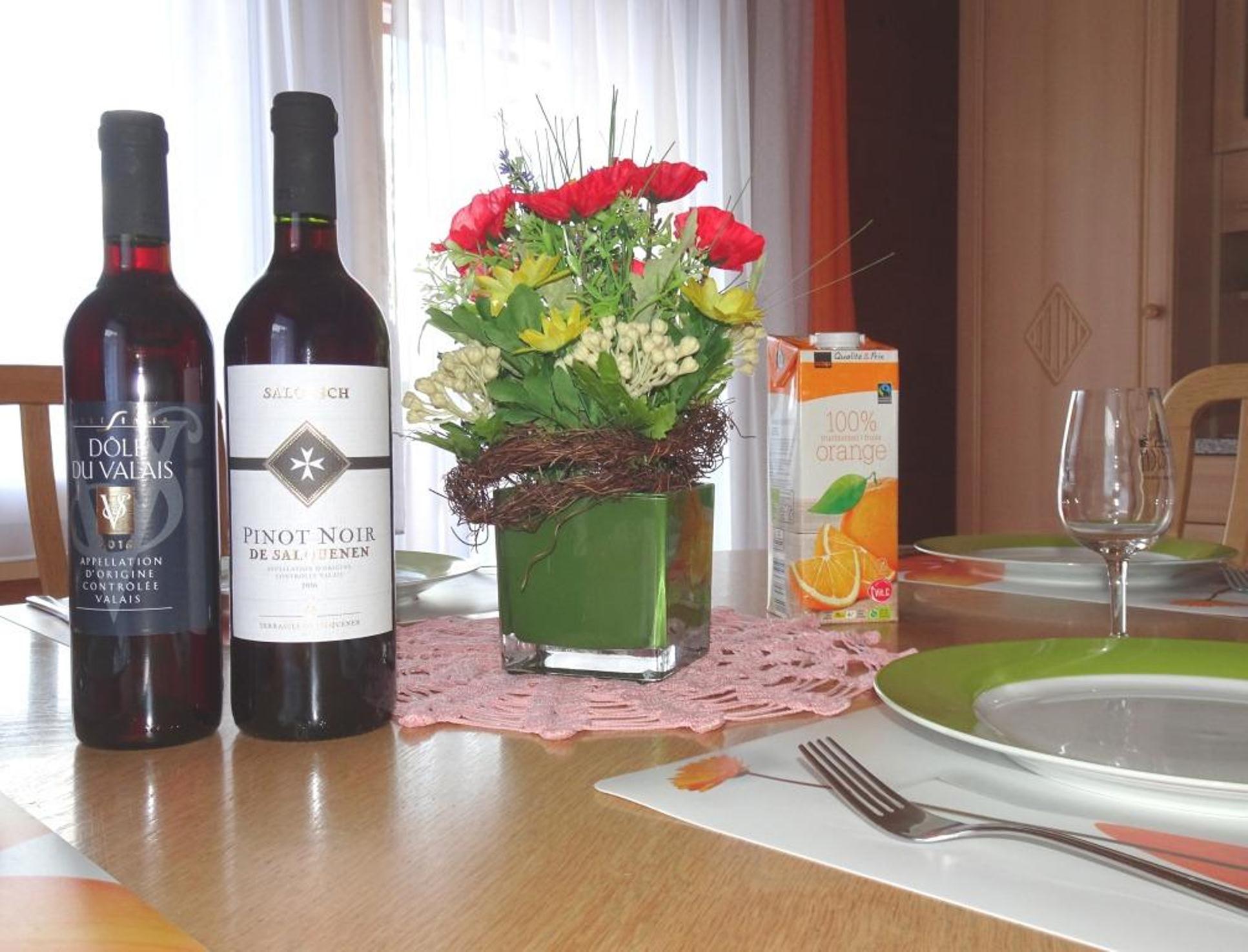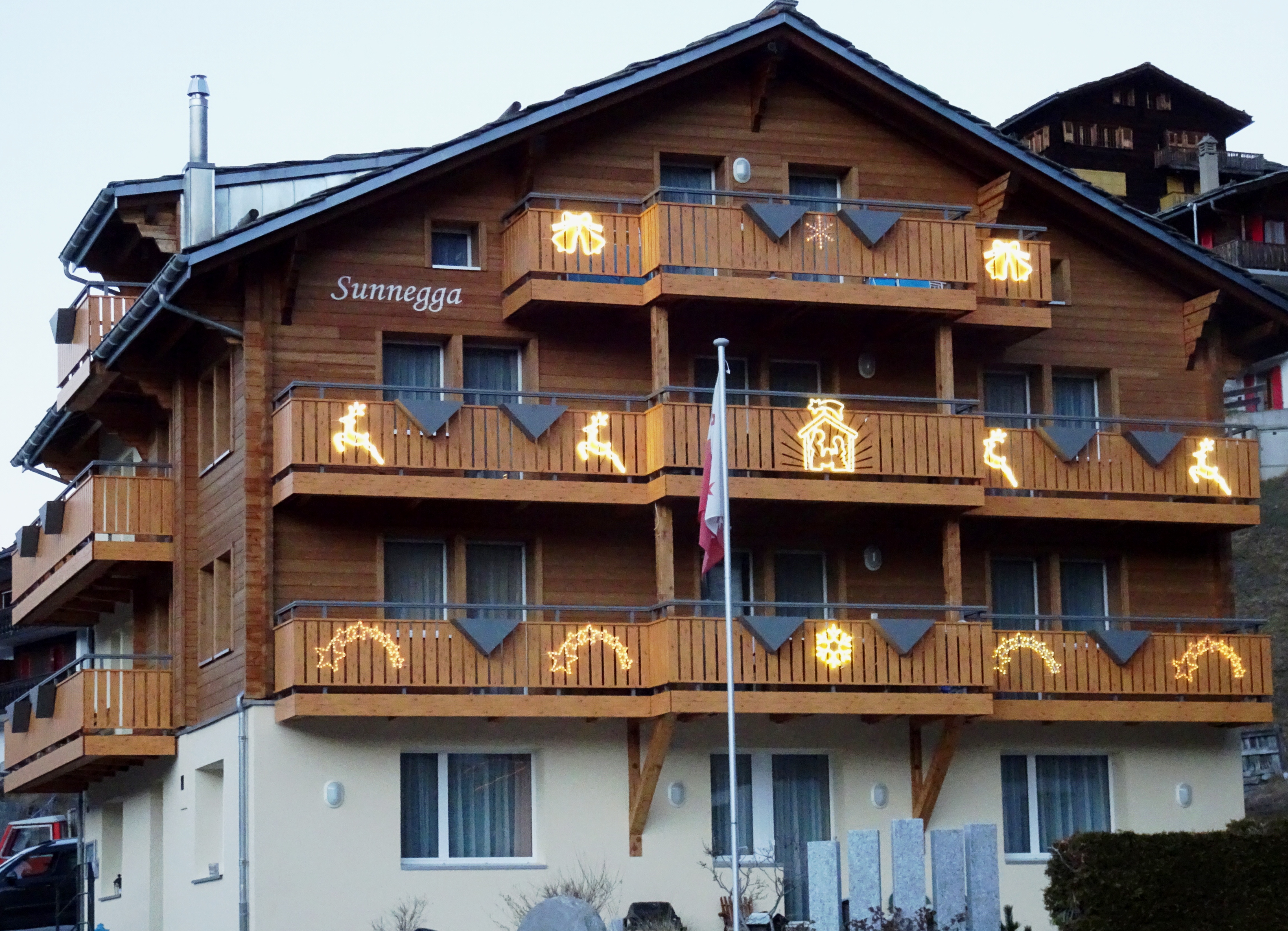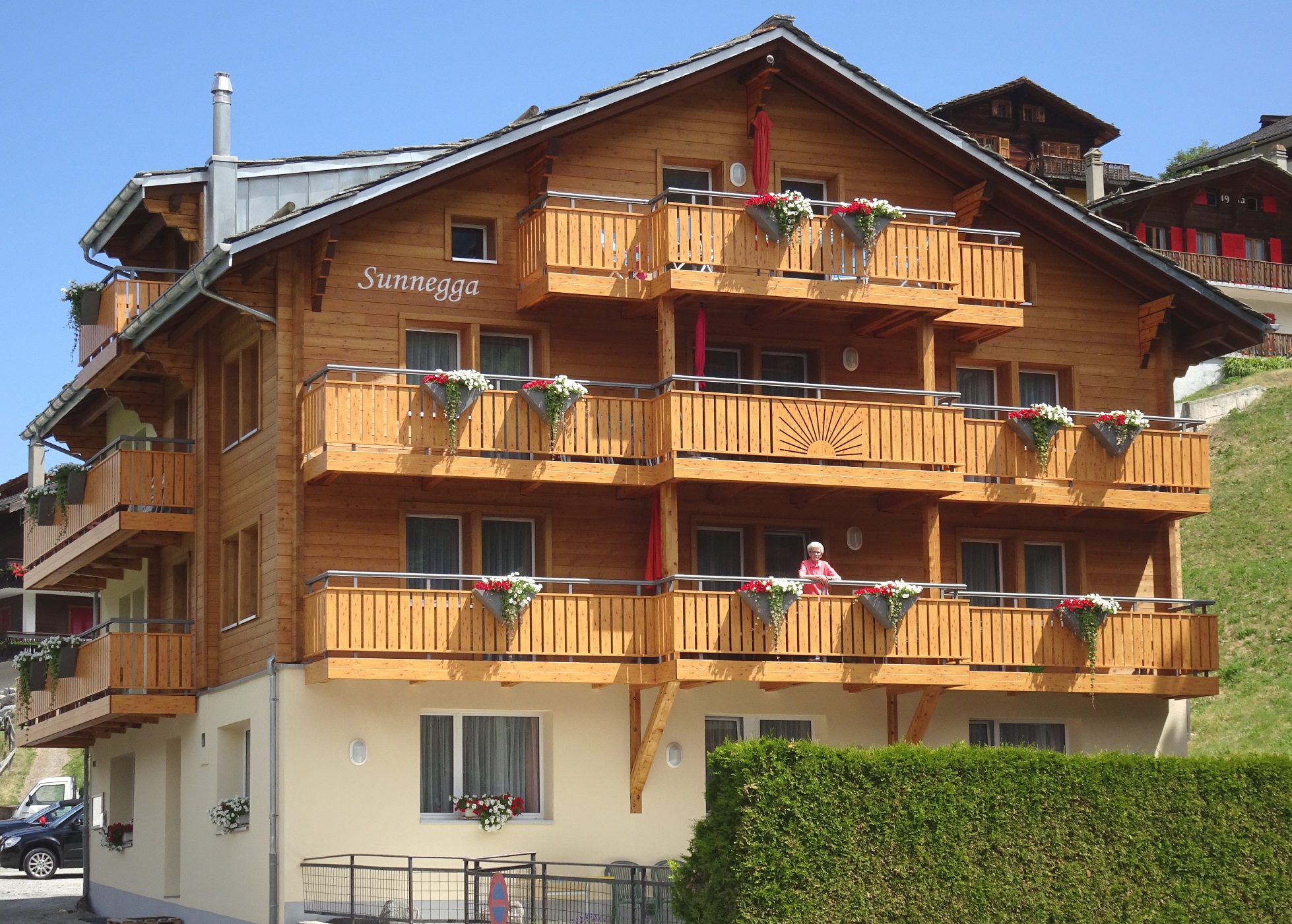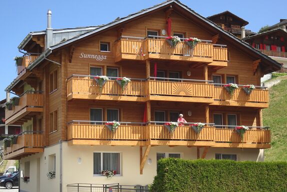 Unser Chalet Sunnegga liegt ruhig an einer Quartierstrasse, zirka 600 m von der Gondelbahn und dem Dorfzentrum entfernt, im Weiler Egga, im sonnigsten Teil von Grächen. Darum der Name SUNNEGGA = sonnige Ecke! Das Chalet bietet komfortable Ferienwohnungen für 2 - 9 Personen an mit einer wunderschönen Aussicht auf die herrliche Bergwelt. Selbst die Spitze des Matterhorns ist zu sehen! Daneben grüssen das imposante Weisshorn und Bishorn (ebenfalls Viertausender), davor das schmucke Brunegghorn. Die Vermieter-Familie wohnt im Haus. Private Parkplätze direkt hinter dem Haus. Die beiden Ferienwohnungen verfügen jeweils über 115 m2, haben einen grosszügigen Südbalkon mit Tisch zum Essen, Liegestühle, einen kleineren Westbalkon, um die Abendsonne zu geniessen, sowie einen kleinen Ostbalkon. Sämtliche Bett-, Küchen- und Frottierwäsche ist vorhanden. Jede Ferienwohnung hat ein eigenes gemütliches Wohnzimmer mit Flachbild-Fernsehen. Ganz in der Nähe der Talstation der Hannigalp-Bahn steht den Gästen ein privater Skiraum zur Verfügung (nicht beheizt). Herzlich willkommen!