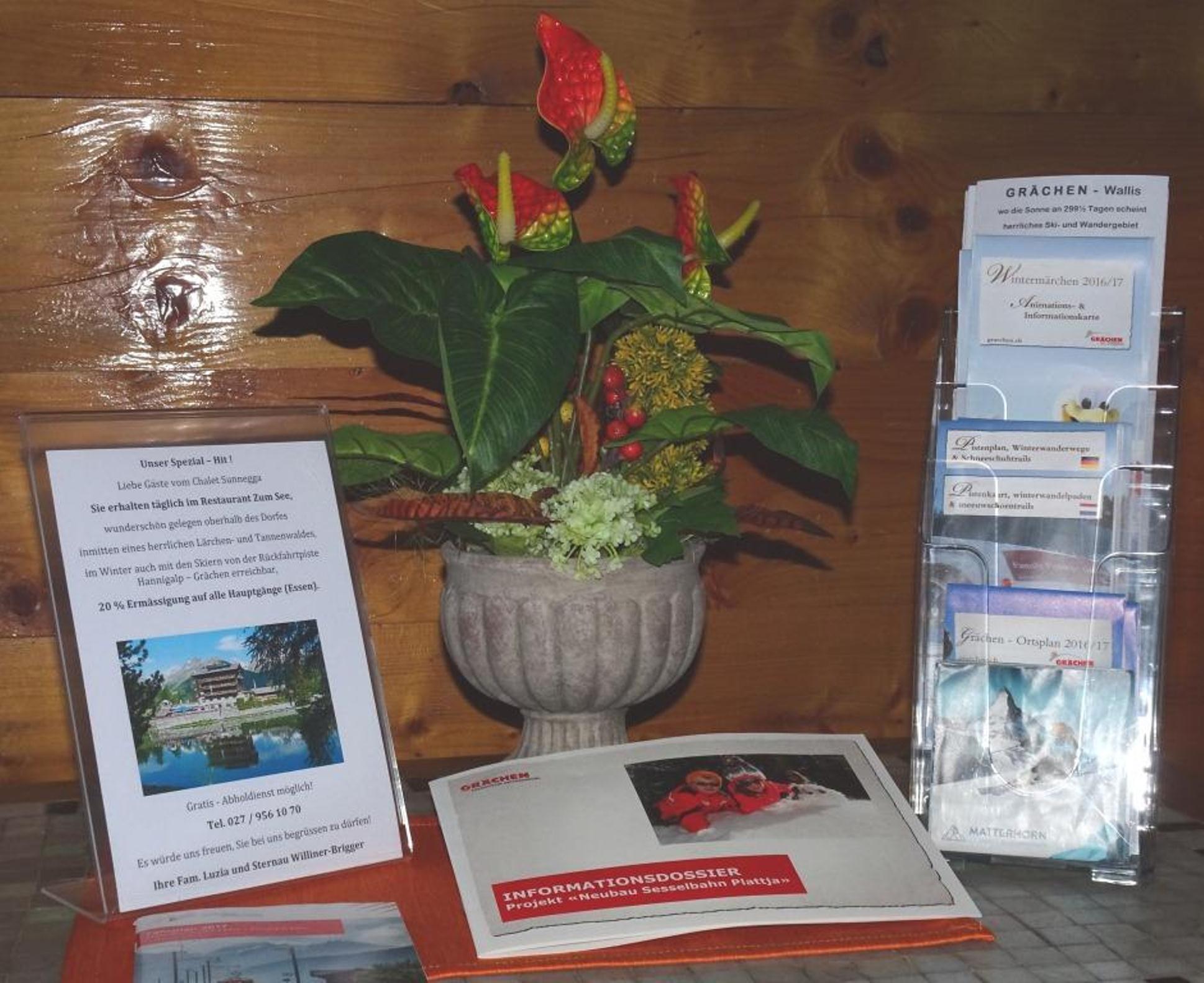 SPEZIAL-HIT: Unsere Hausgäste erhalten im Restaurant Zum See, etwas oberhalb des Dorfes am kleinen Grächnersee inmitten eines herrlichen Waldes gelegen, bei der Fam. Williner-Brigger (Tochter des Hauses) 20% auf alle Hauptgänge beim Mittagessen und 10 % auf alle Speisen beim Abendessen! Am Abend gibt es eine spezielle kulinarische Menukarte (eine Anmeldung ist sehr wünschenswert). Das Restaurant ist im Winter auch bequem mit den Skis erreichbar. Gratis-Abholdienst. Guten Appetit!