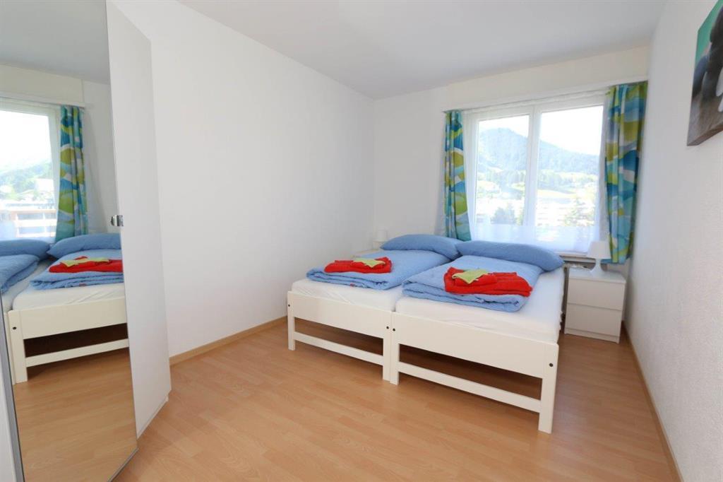 4 Zimmerwohnung (ca. 100 m2) im 4. Stock, Mehrfamilienhaus mit Lift, Balkon mit Aussicht auf die Berge, Autoabstellplatz hinter dem Haus, Mitbenützung des Skiraums, der Waschmaschine und des Trockenraumes. Küche mit Backofen, 4-Plattenglaskeramikherd, Kühlschrank mit Tiefgefrierfach, Mikrowelle, Racletteofen, Fondueset; Bad/WC; 3 Schlafzimmer mit je 2 Einzelbetten, Wohnzimmer mit Essecke, ausziehbarer Schlafcouch, wunderschönes Eckfenster mit Aussicht, Stereo, TV, DVD Player, WLAN; Kinderfreundlich; Bettwäsche, Frotteewäsche, Küchentücher, Duvet nordisch; Abfallsäcke blau. Haustiere nicht erlaubt. Nichtraucher-Wohnung!