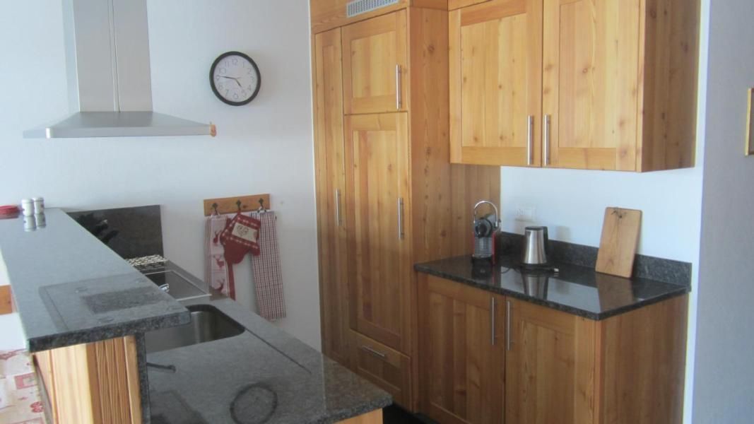 Die Innenausstattung lässt keine Wünsche offen: Genießen Sie den hohen Ausbaustandard, zu welchem edle Platten- und Parkettböden zählen, komplett mit flächendeckender Bodenheizung. Für eine heimelige Atmosphäre sorgt das verwendete Arvenholz in Küche und Einbauschränken. Die moderne Küche ist bestens ausgestattet mit einem Kühlschrank inklusive Tiefkühlfach, Glaskeramikherd (Induktion), Backofen und vielseitigen Küchengeräten wie Kaffeemaschine (Nespresso, Filter, Moka Express), Stabmixer, Toaster und Wasserkocher, ergänzt durch Fondue- und Raclette-Rechaud. Ein hochwertiges Badezimmer mit Badewanne/Dusche und Doppellavabo rundet die komfortable Innenausstattung ab.