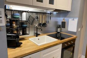 Die Wohnung befindet sich im 3. OG und ist bequem über einen Fahrstuhl zu erreichen. Sie verfügt bei 1,5 Zimmern über circa 35 m². Die Küche ist sehr gut ausgestattet und bietet so ziemlich alles, was man zum Zubereiten einer leckeren Mahlzeit benötigt. Zur Wohnung gehört ein kostenfreier Parkplatz direkt am Haus.