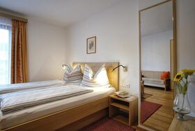Doppelzimmer mit Ausziehcouch, Dusche, WC, Sat-TV, großzügiger Balkon mit Seeblick.