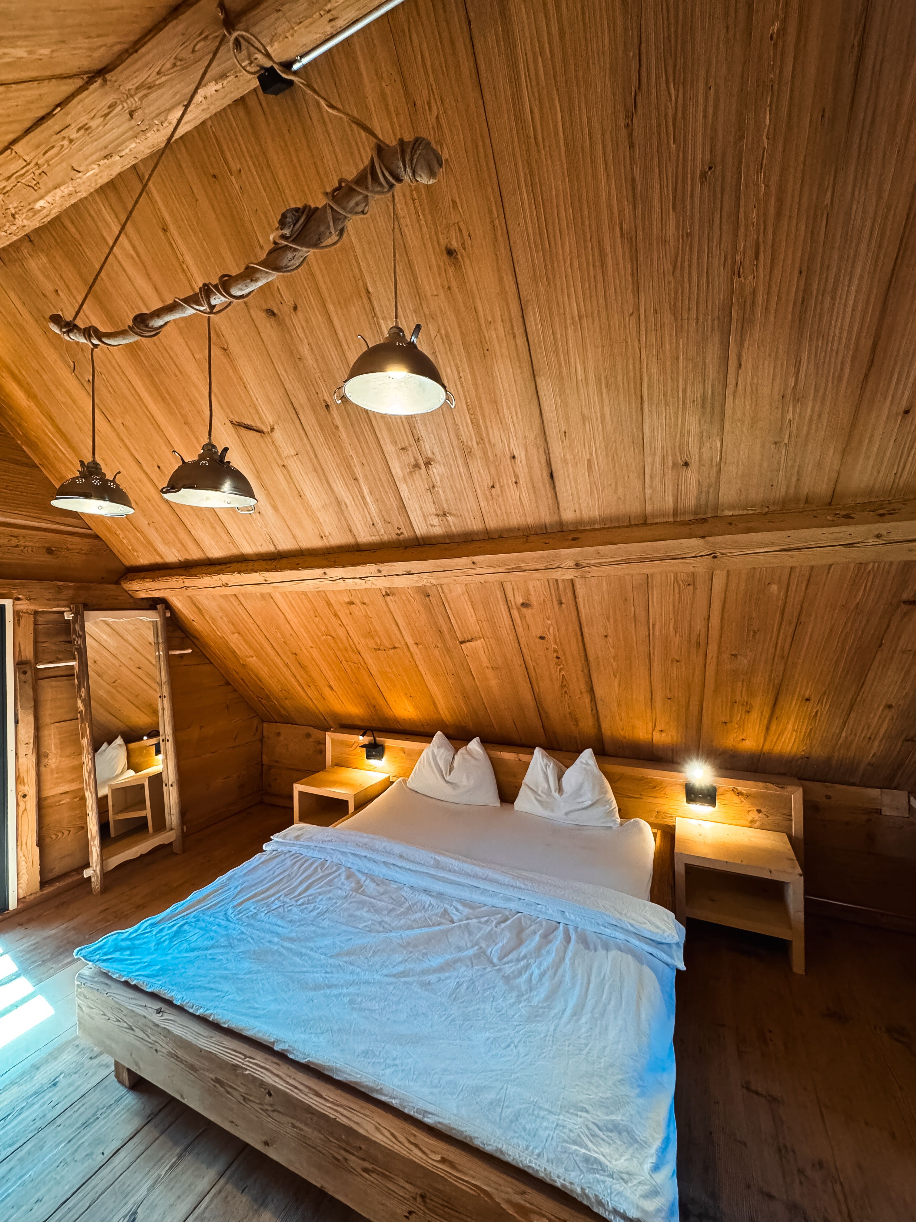Das denkmalgeschützte Haus ist nicht beheizt, Wärme spenden dafür die Alpaka-Wollduvets, ein Lagerfeuer oder eine herzliche Umarmung der Mitreisenden.