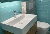 Badezimmer: Saniert im Sommer 2024 mit modernen Fliesen, großem Waschbecken, Glasduschwand und Wäschereck.