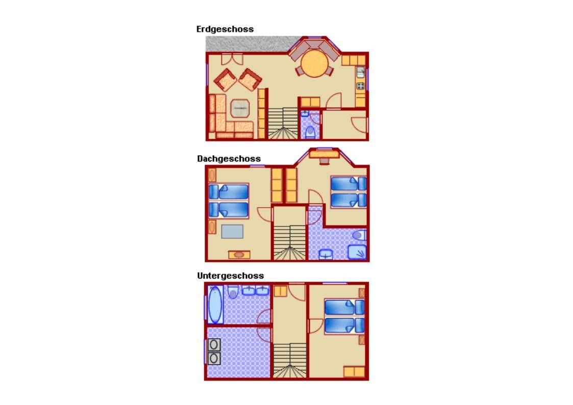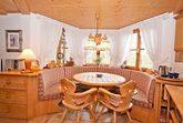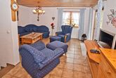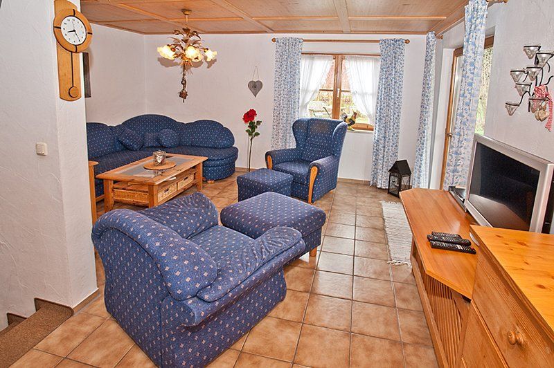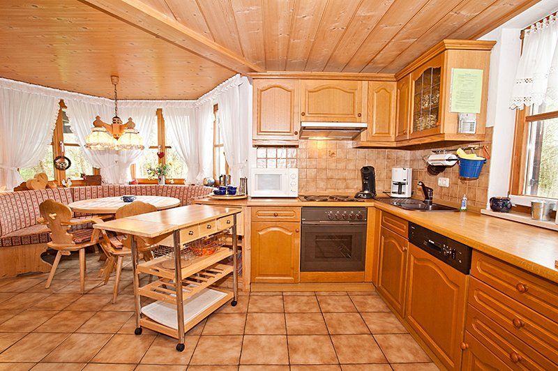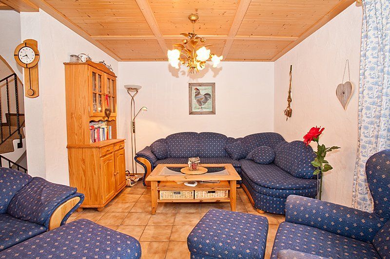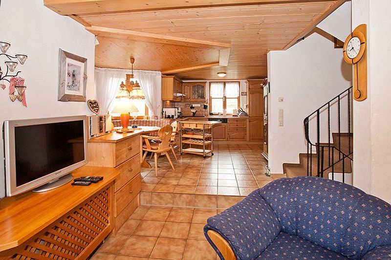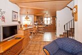 Im Erdgeschoss erwartet Sie eine gut ausgestattete Küche mit zusätzlichen Geräten wie einem elektrischen Fondue und Wok. Der sonnige Essbereich bietet einen Blick auf den Garten und den „Reichenbach“. Der angrenzende Wohnbereich lädt mit Sesseln, Sofa, TV und Gesellschaftsspielen zum Entspannen ein.