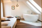 Vollausgestattete Küchenzeile, eigener Wohnraum, Badezimmer mit Dusche. Badewanne mit ausgewählten Biopflegeprodukten im Schlafzimmer, bequemes Doppelbett mit Premium Matratzen, Privatterrasse mit Blick ins Grüne auf unsere Streuobstwiesen. Individuelle Rückzugsorte mit Liegestühlen und Sitzecken, kostenlose WLAN-Internetverbindung, hochwertige und natürliche Materialien, alle klassischen Zimmerstandards von Minibar über großem Flat-TV bis hin zum Profi-Fön und Klimaanlage.