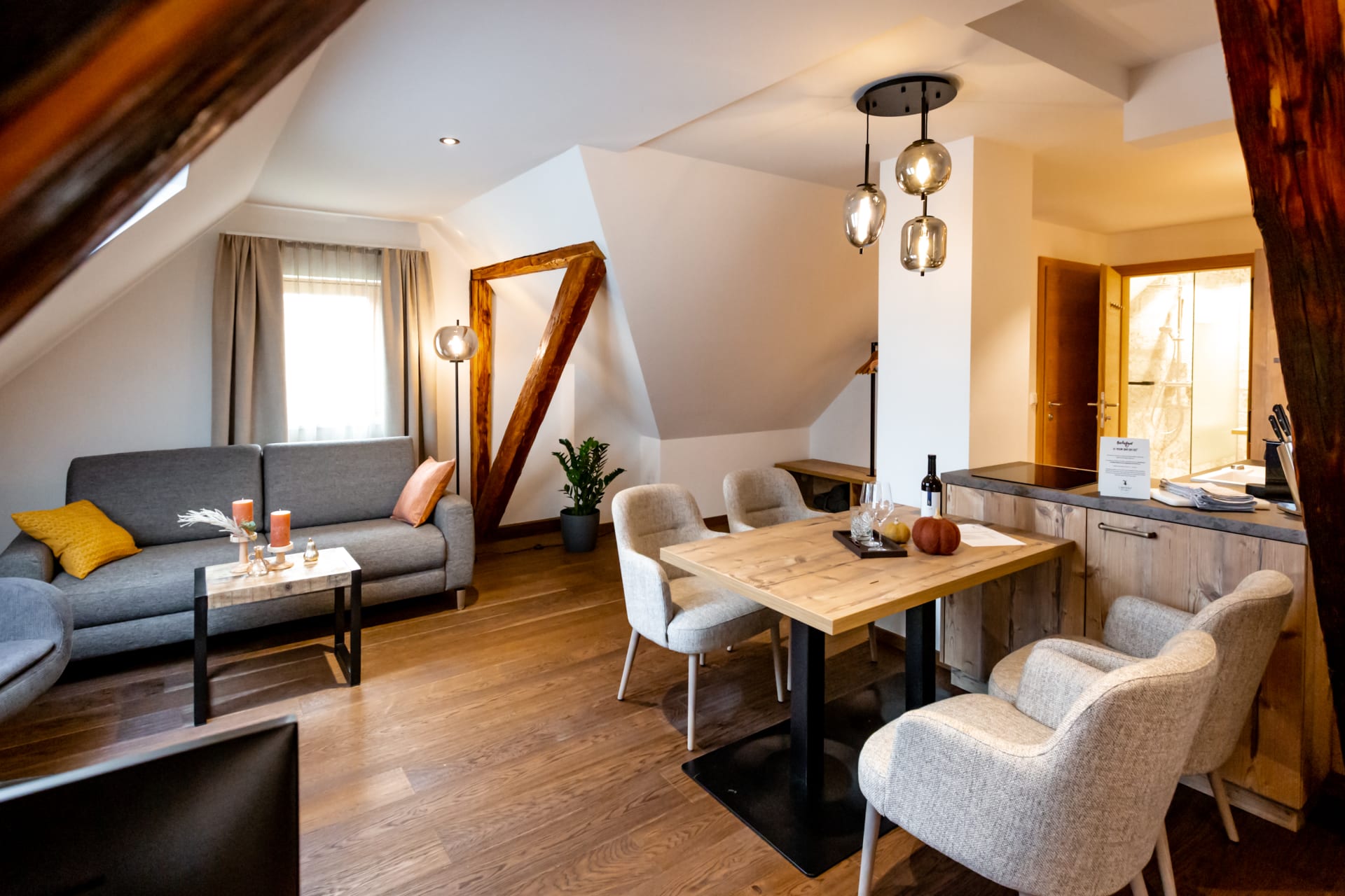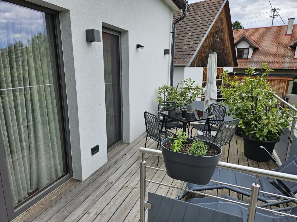 Das Appartment hat einen eigenen Zugang, vollausgestattete Küchenzeile, eigenen Wohnraum, Badezimmer mit Dusche, Badewanne mit ausgewählten Biopflegeprodukten, bequemes Doppelbett mir Premium Matratze, Privatterrasse oder Balkon mit Blick ins Grüne auf unsere Streuobstwiesen. Sie finden individuelle Rückzugsorte mit Liegestühlen und Sitzecken. Ein Rückzugsort, der Ruhe und Geborgenheit ausstrahlt und gleichzeitig ein Ort der Begegnung. Modern ohne kühl zu sein.