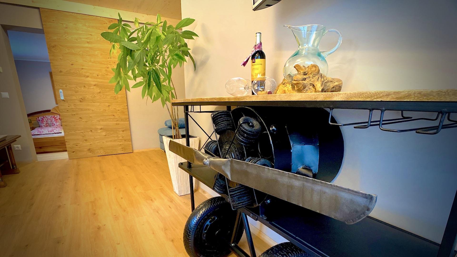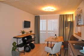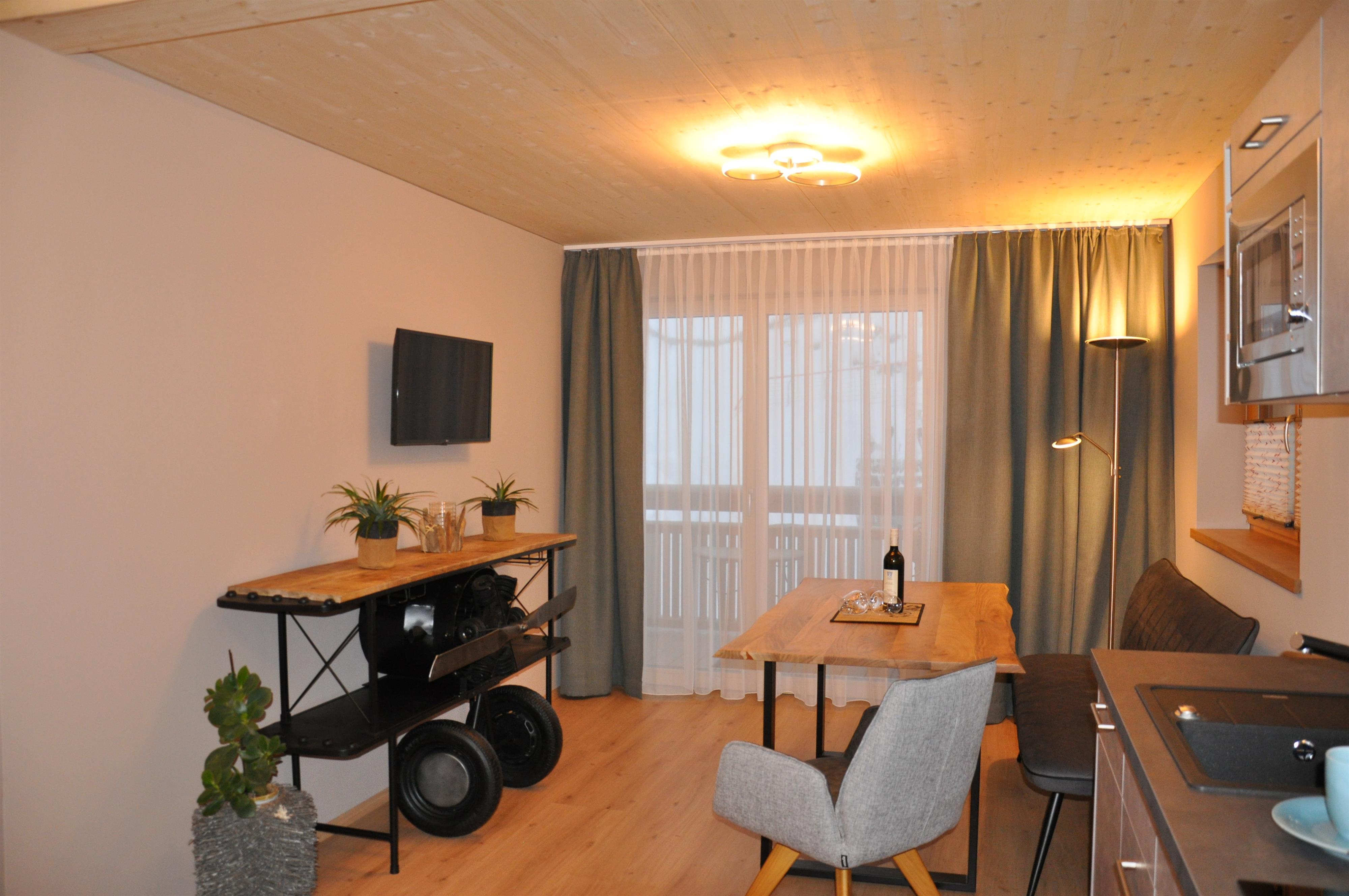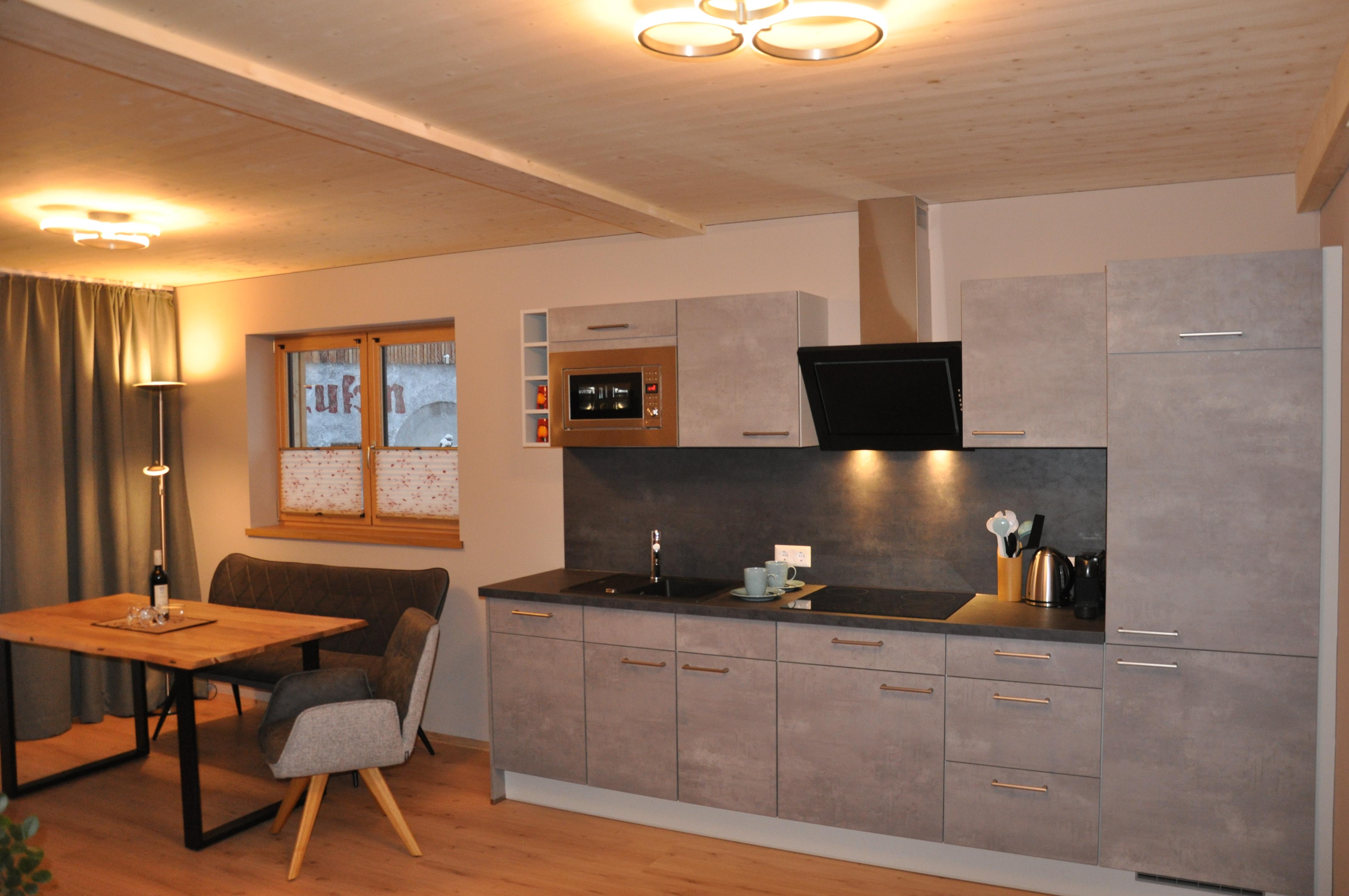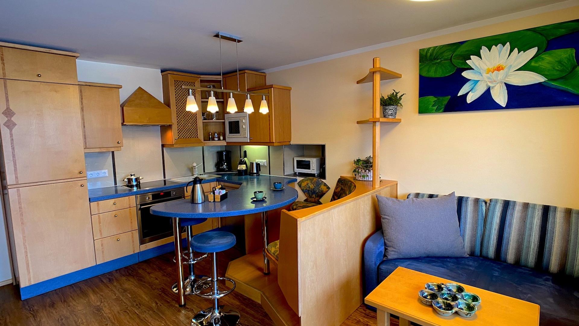 Die kleine Küche verfügt über einen modernen Küchenblock mit Geschirrspüler (kein Backrohr). Das Badezimmer ist mit Dusche, WC und Föhn ausgestattet. Hochwertige Wellness-Matratzen garantieren erholsamen Schlaf. Der nach Westen ausgerichtete Balkon fängt die lange Abendsonne ein – perfekt für entspannte Stunden mit Blick ins Grüne.