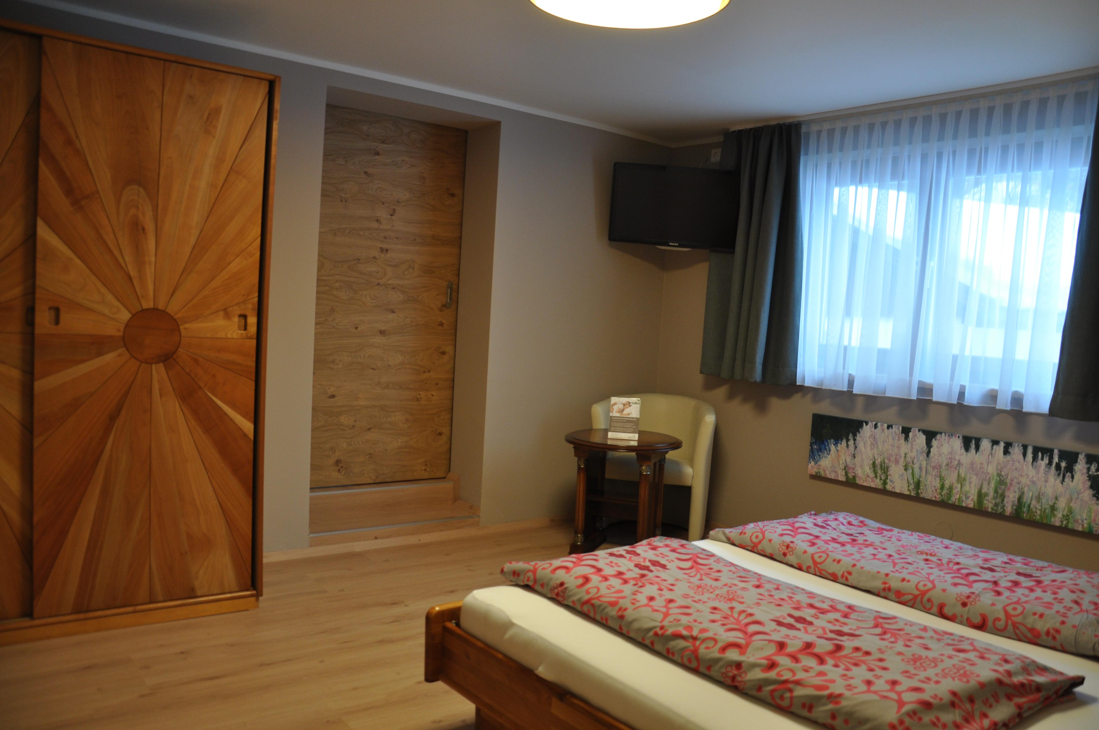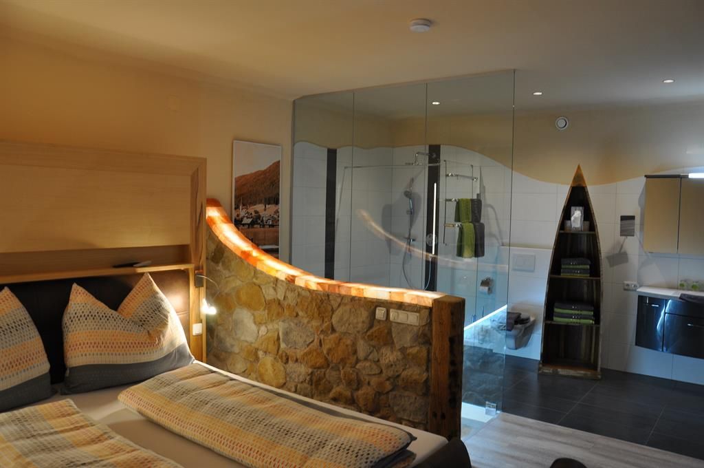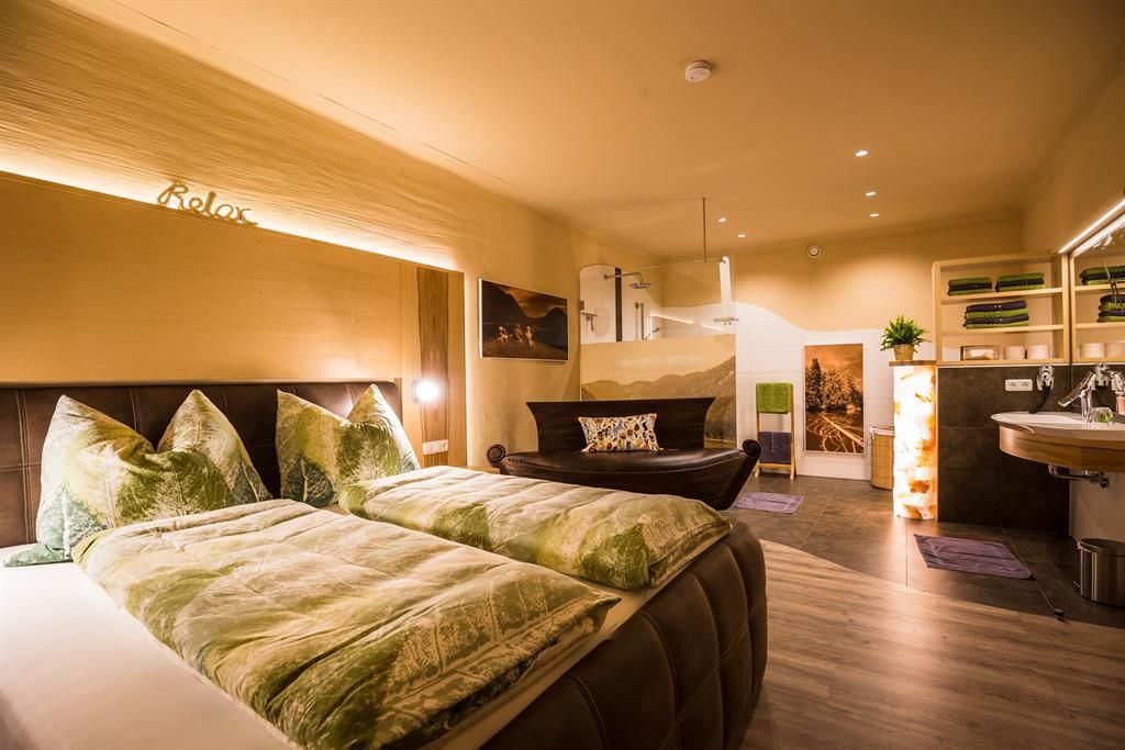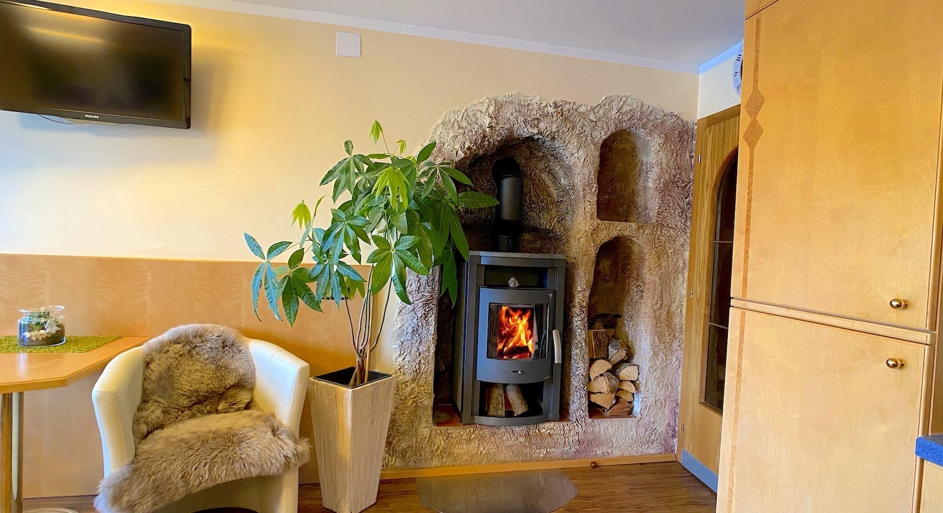 Die Wohnung Margerite liegt im ersten Stock des Haupthauses und bietet eine gemütliche, gut ausgestattete Rückzugsoase mit liebevollen Details. Das separate Schlafzimmer ist mit einem Doppelbett und Sat-TV ausgestattet, während der neu gestaltete Wohnraum mit Esstisch, Sat-TV und ausziehbarer Komfort-Couch zum Entspannen einlädt. Eine Schiebetür sorgt für Privatsphäre zwischen Wohn- und Schlafbereich – ideal auch, wenn Kinder mitreisen.