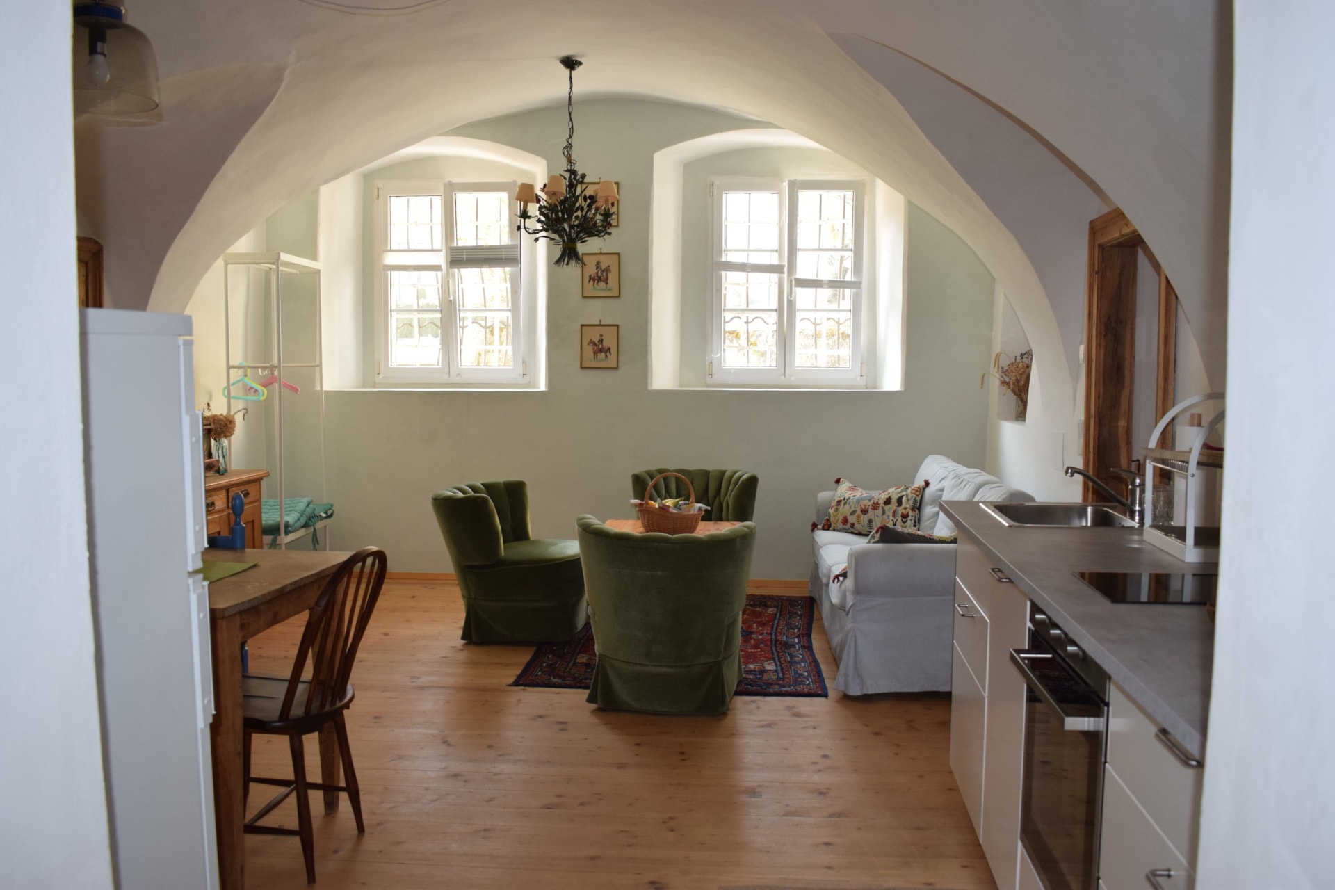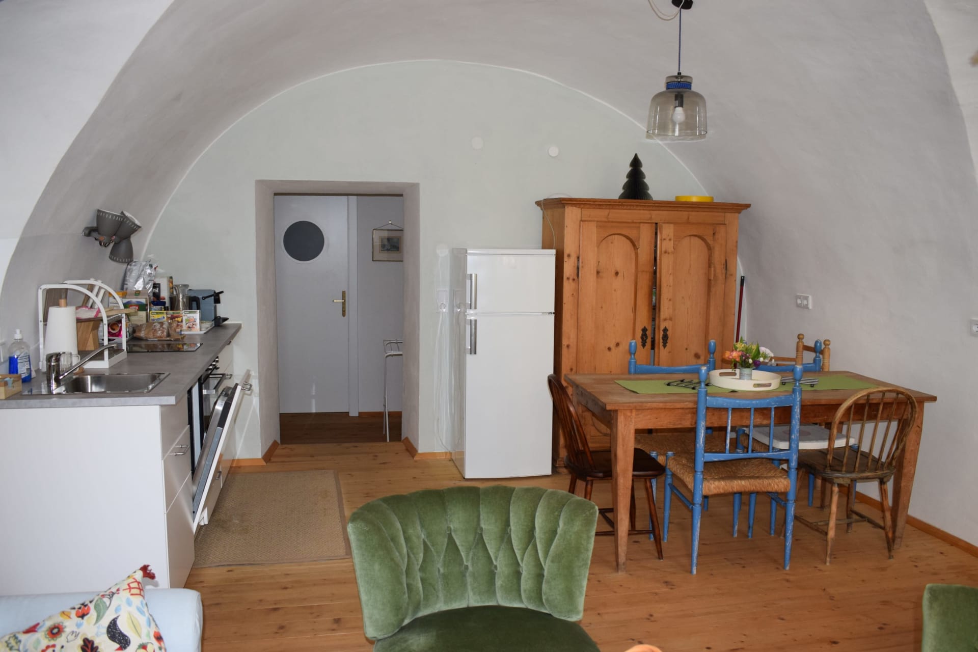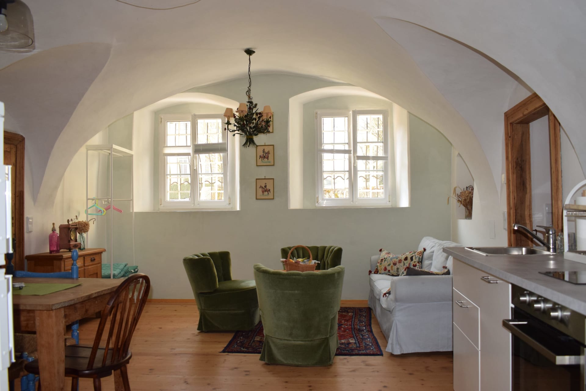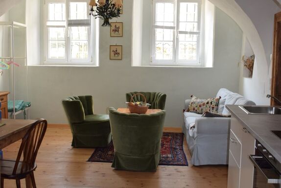 (ehemalige Hofküche) – ca. 60 m² im EG Gewölbe, 3 Betten, 2 Zimmer, Wohnküche, Dusche, WC, Waschmaschine