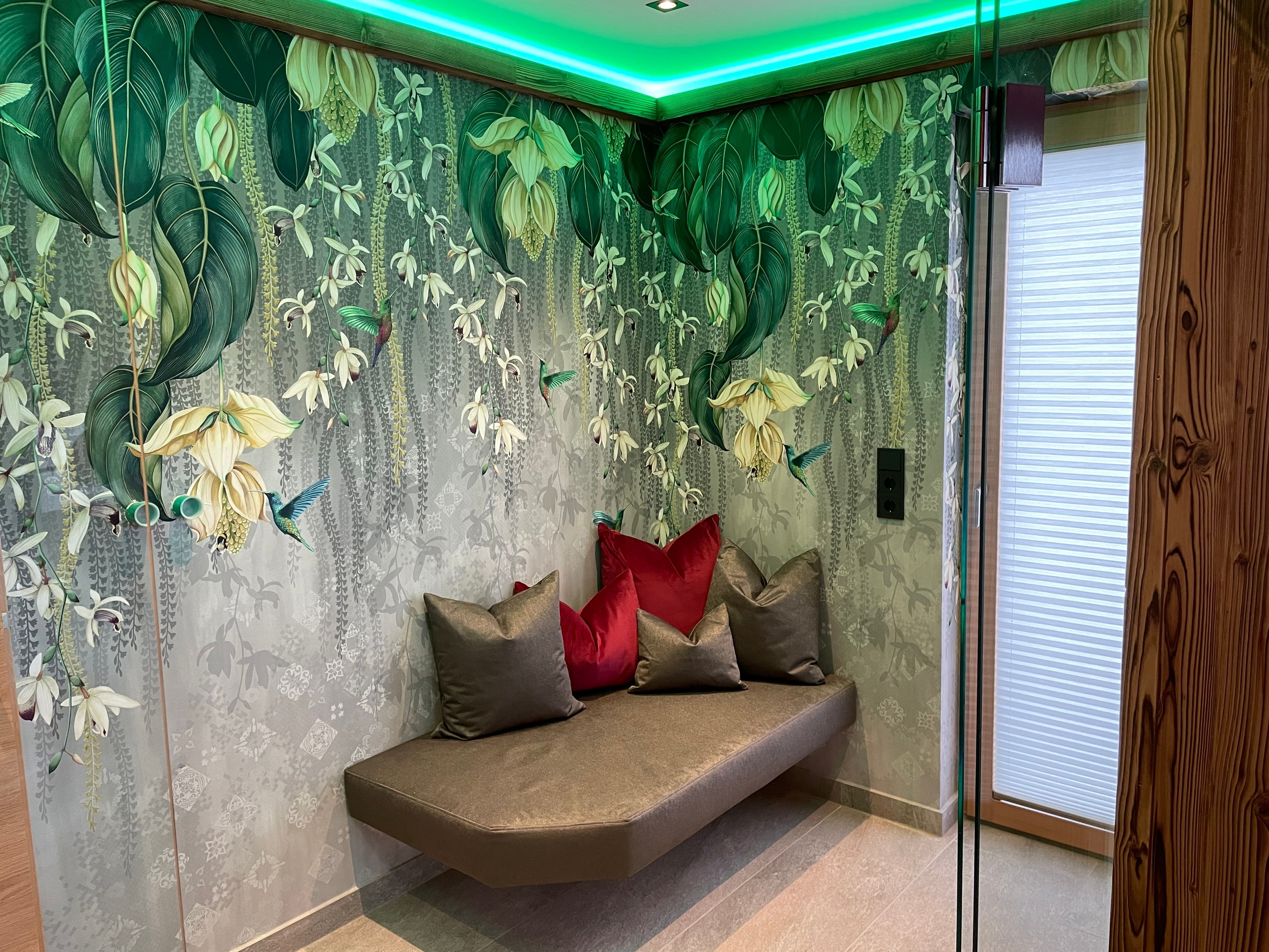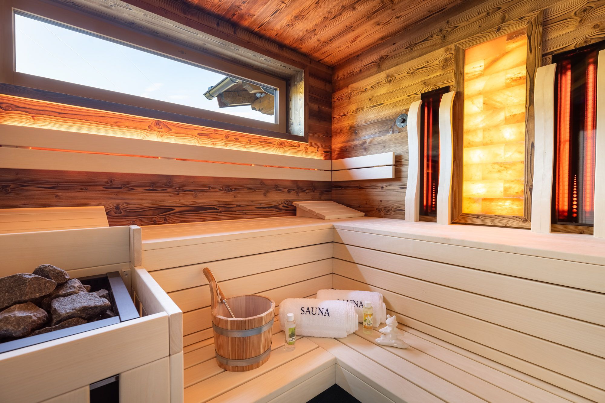 Der private Wellnessbereich mit Sauna und Panoramablick auf den Dachstein lädt nach einem aktiven Tag zum Entspannen ein.