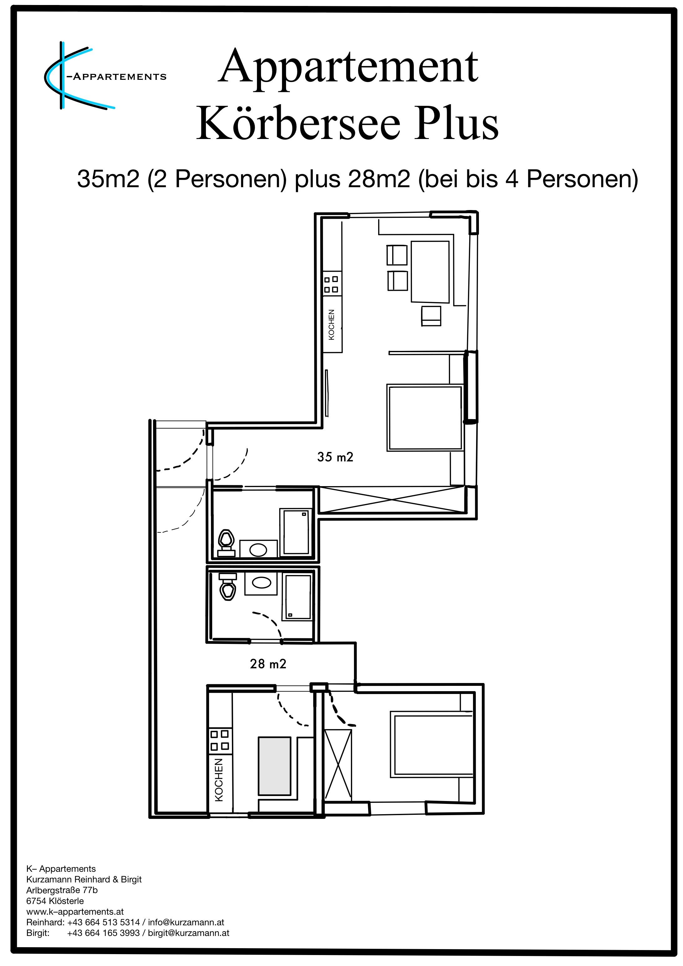 Das Appartement Körbersee plus bietet mit seinem modernen Design auf 63 m² großzügige Raumaufteilung für 2-4 Personen. Ganz dezent verschmelzen im Studiobereich Schlafzimmer und Living mit Küchenzeile und Sitzecke für bis 6 Personen zu einer Einheit. Zudem verleiht das Badezimmer mit Dusche/WC in seiner schlichten Eleganz dem Appartement noch einen ganz speziellen Charakter. Ein weiteres Schlafzimmer, ein 2. Badezimmer, ebenfalls mit DU/WC und eine 2. Küche mit Sitzbereich bieten große Flexibilität für dieGäste. Sehen Sie sich den Grundriss in der Fotogallery an.