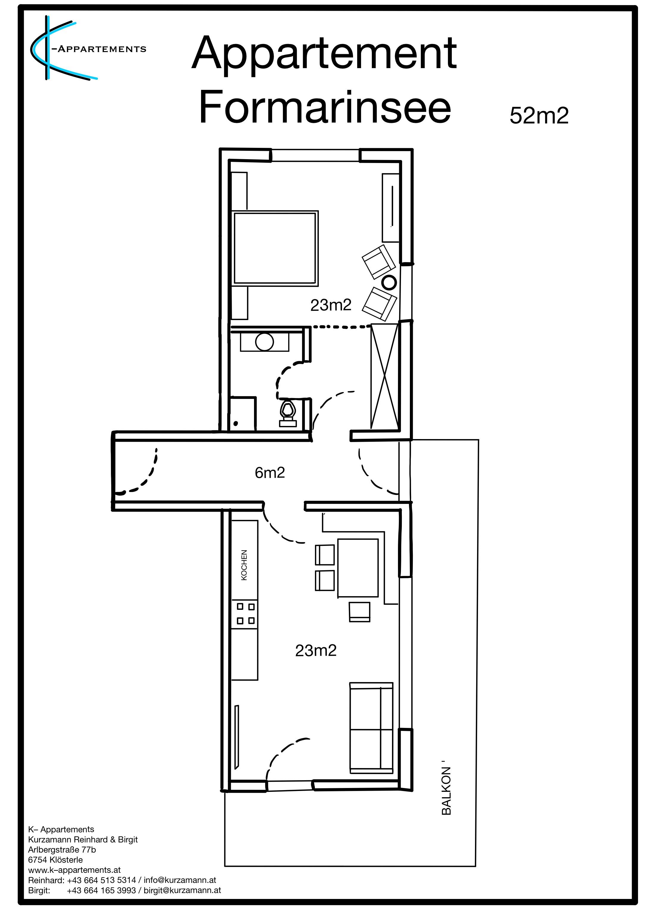 Das Appartement Formarinsee bietet mit seinen großzügigen 52 m² ausreichend Comfort für 2-4 Personen. Die einladende Wohnküche ist bestens ausgestattet und bietet zur Essecke zusätzlich ein gemütliches Sofa, das man auch zum Schlafbett umwandeln kann. Das moderne Schlafzimmer verfügt über ein großes Doppelbett und Badezimmer mit Dusche/WC. Ein großer Balkon lädt an warmen Tagen zum Verweilen ein.