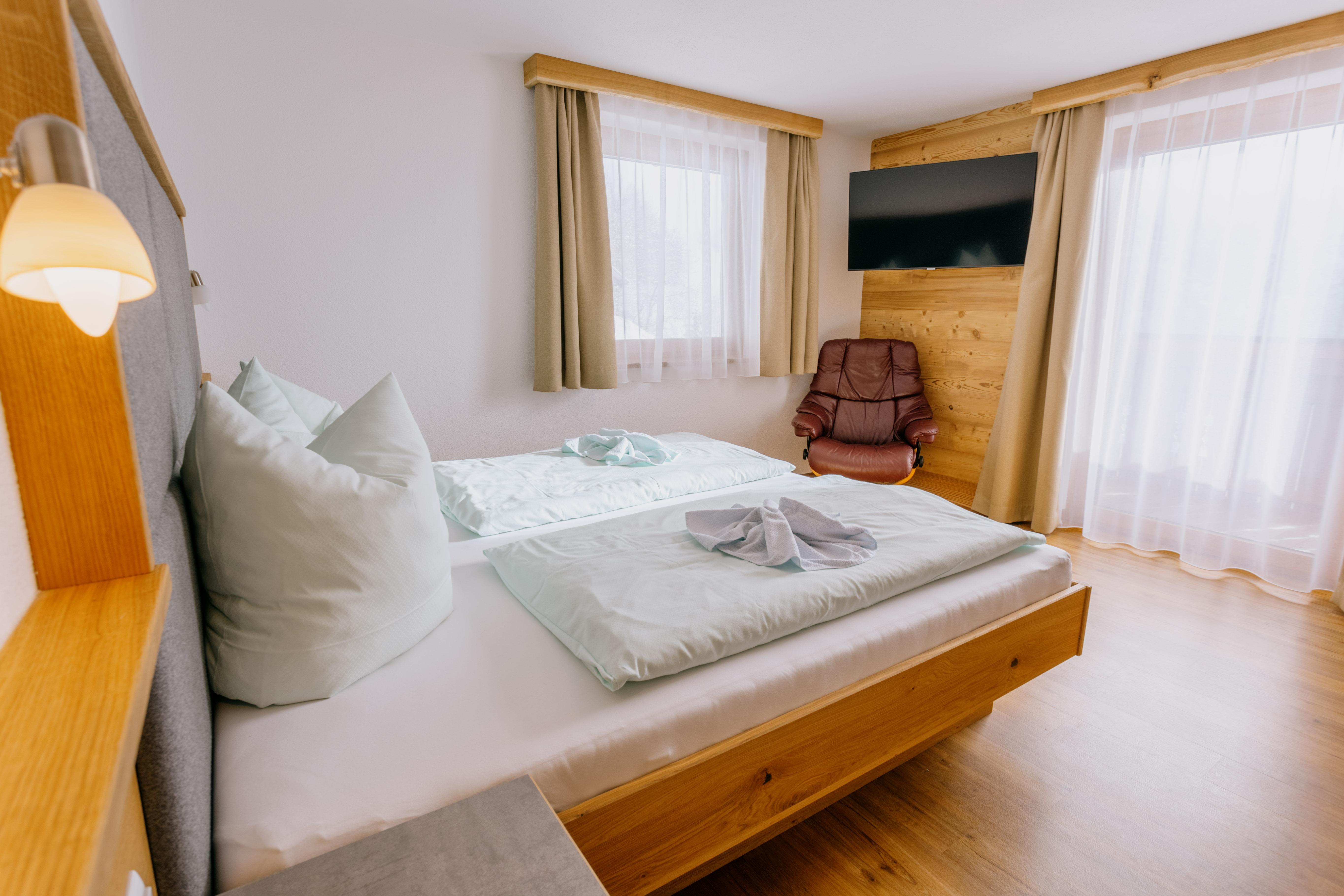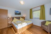 Die Ferienwohnungen Wiesengrün und Himmelblau (60m²) mit herrlichem Ausblick in die Bergwelt! 2 Schlafräume mit je 2 Betten, große Wohnküche mit Flat TV, freies W-Lan, Bad und Toilette sind getrennt. Option für 2 Zusatzpersonen in der Wohnküche ist eine Ausziehcouch. Dazu ein großer Vorraum, großer nach Süden ausgerichteter Balkon mit Blick in die Berge. Frühstück oder Halbpension auf Anfrage zubuchbar!