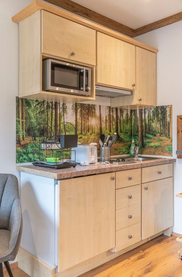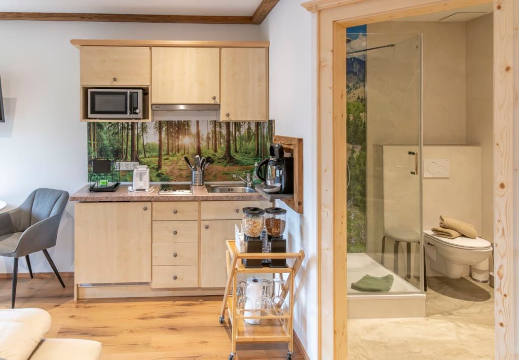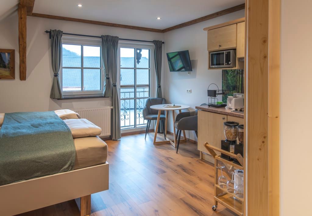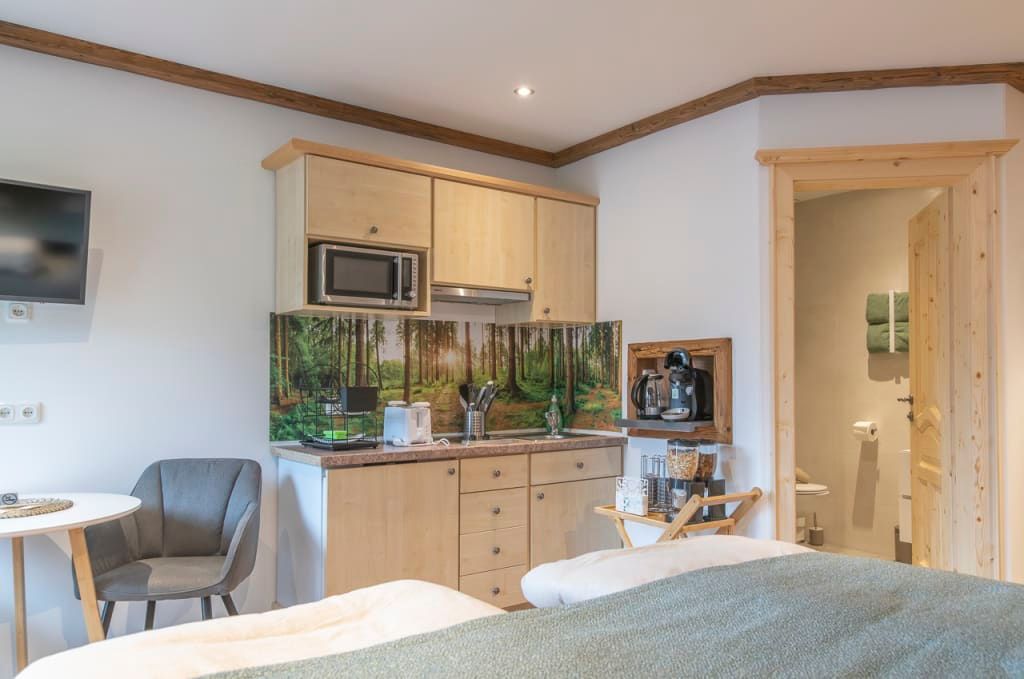 • In unseren 4 neu ausgebauten Studios verwöhnen wir euch mit großem Doppelbett, top ausgestatteter Küchenzeile und Genuss-Highlights wie Müslispender, Tee, Kaffee- und Kakaotabs zur freien Verfügung und einer Flasche Wein am Zimmer. Malerischer Ausblick ins Grüne inklusive!