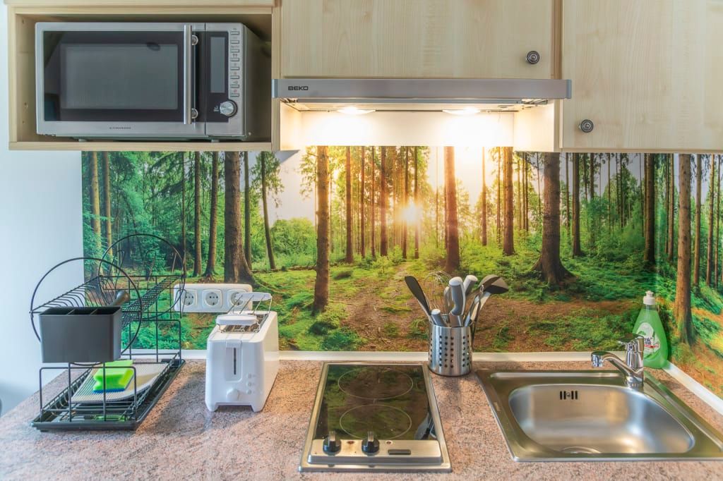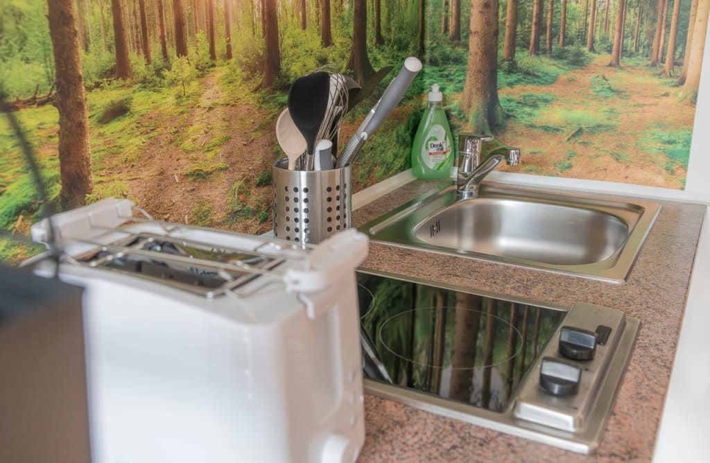 • kleine Küchenzeile (Ceranfeld mit 2 Kochfeldern, Mikrowelle, Kühlschrank, Wasserkocher, Kaffeemaschine, Toaster, Eierkocher, Töpfe, Pfannen, Geschirr, Besteck und Küchenutensilien)