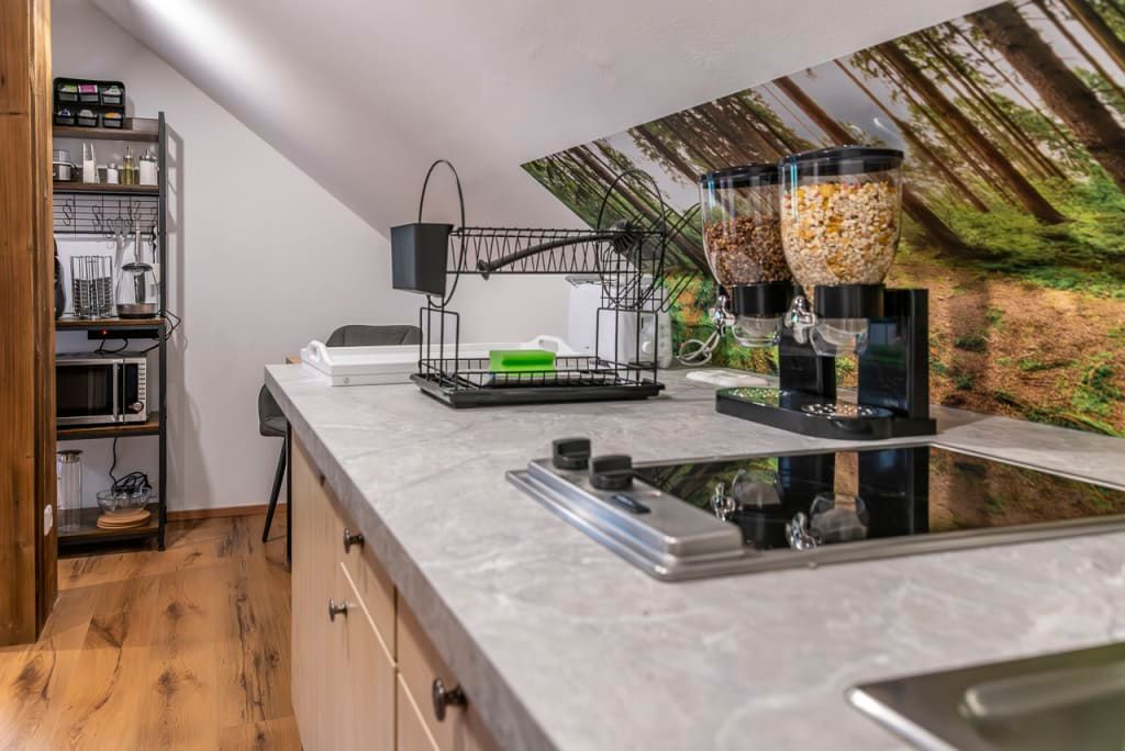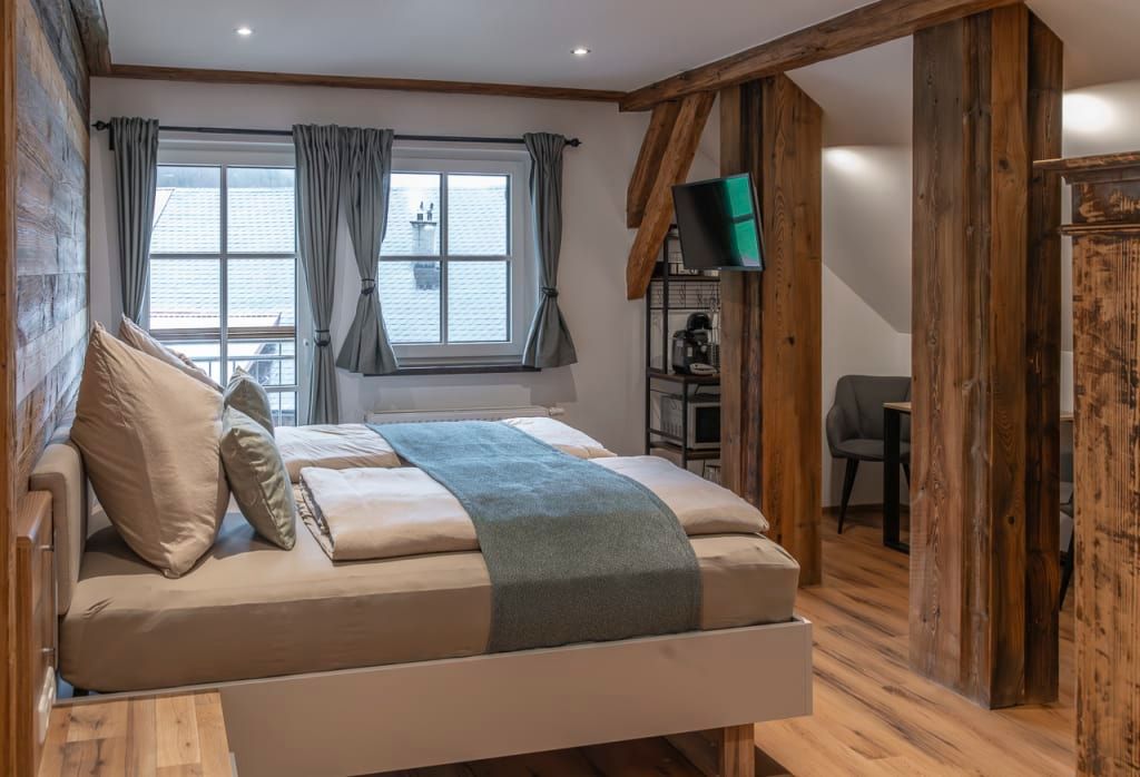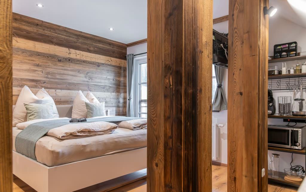 • In unseren 4 neu ausgebauten Studios verwöhnen wir euch mit großem Doppelbett, top ausgestatteter Küchenzeile und Genuss-Highlights wie Müslispender, Tee, Kaffee- und Kakaotabs zur freien Verfügung und einer Flasche Wein am Zimmer. Malerischer Ausblick ins Grüne inklusive!