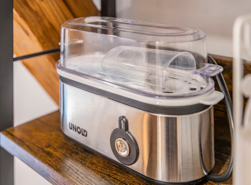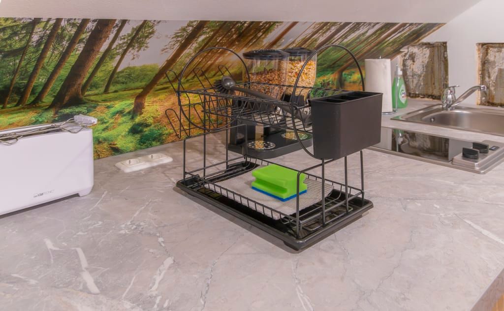 • kleine Küchenzeile (Ceranfeld mit 2 Kochfeldern, Mikrowelle, Kühlschrank, Wasserkocher, Kaffeemaschine, Toaster, Eierkocher, Töpfe, Pfannen, Geschirr, Besteck und Küchenutensilien)