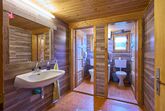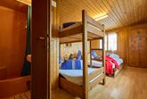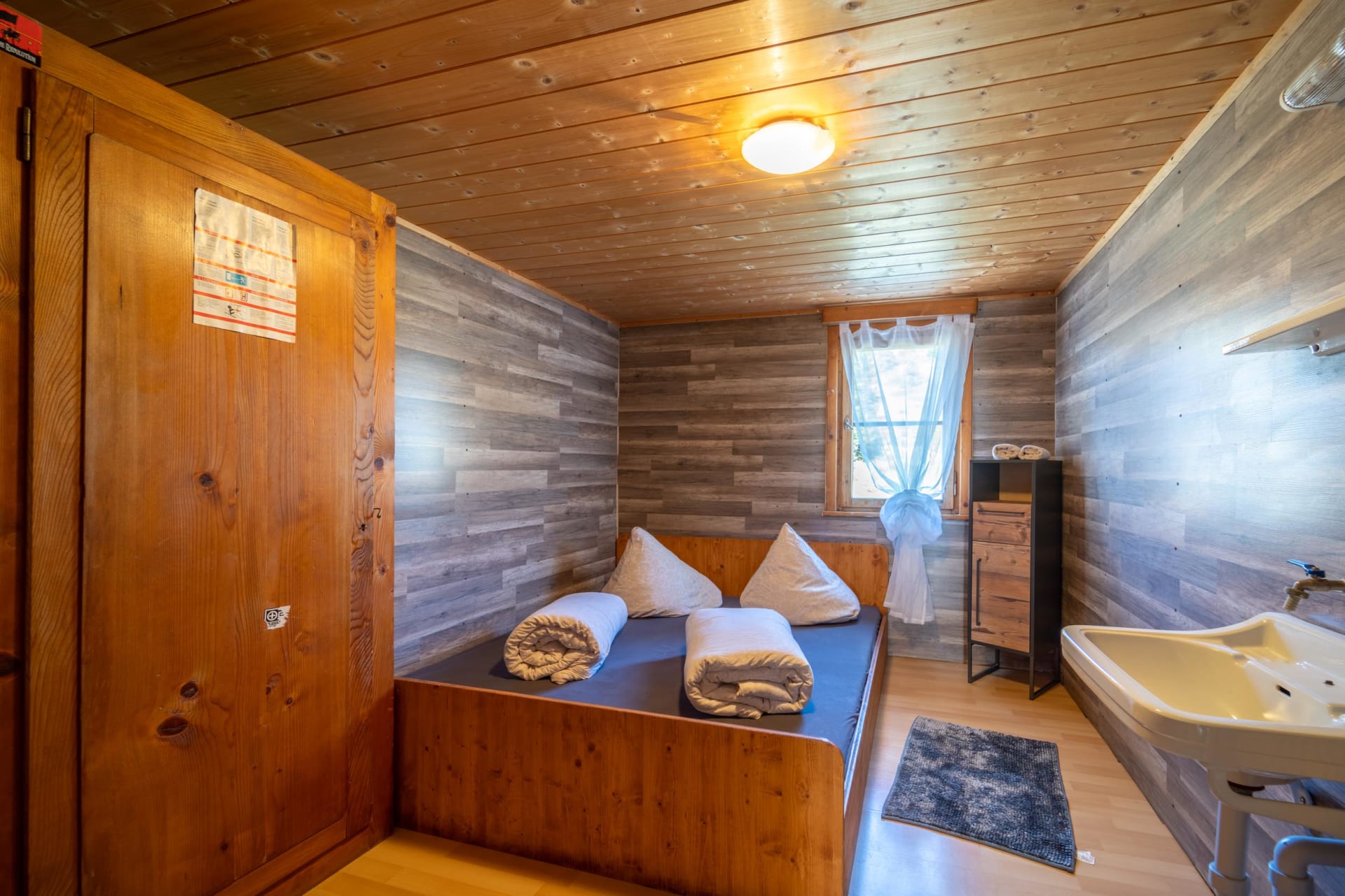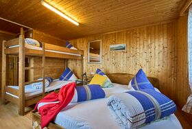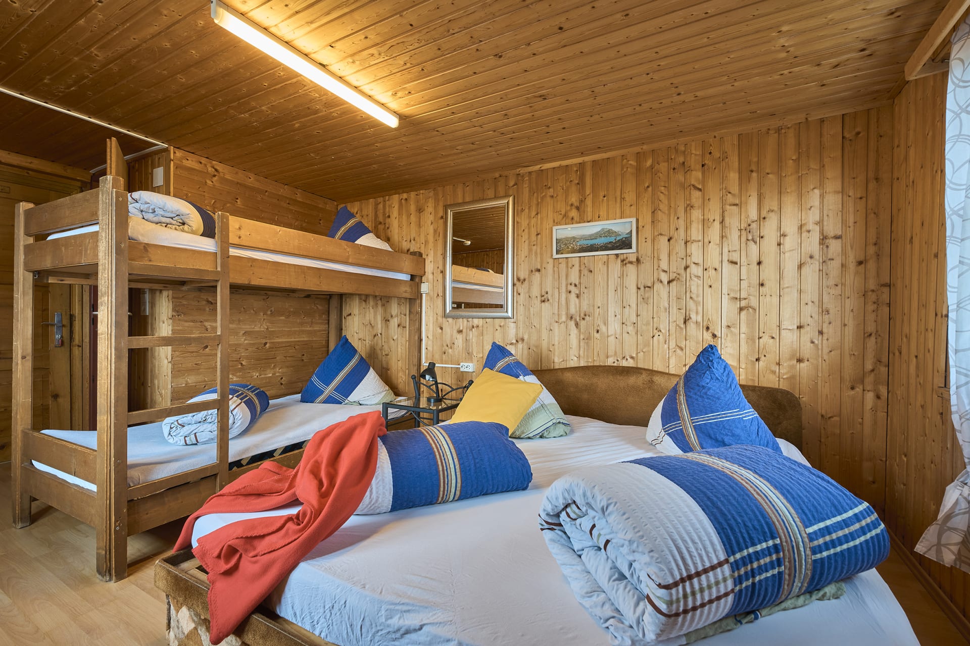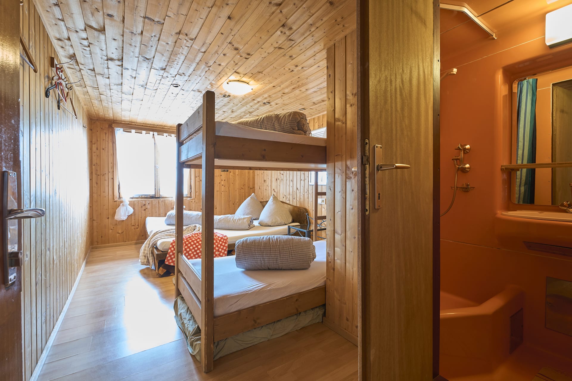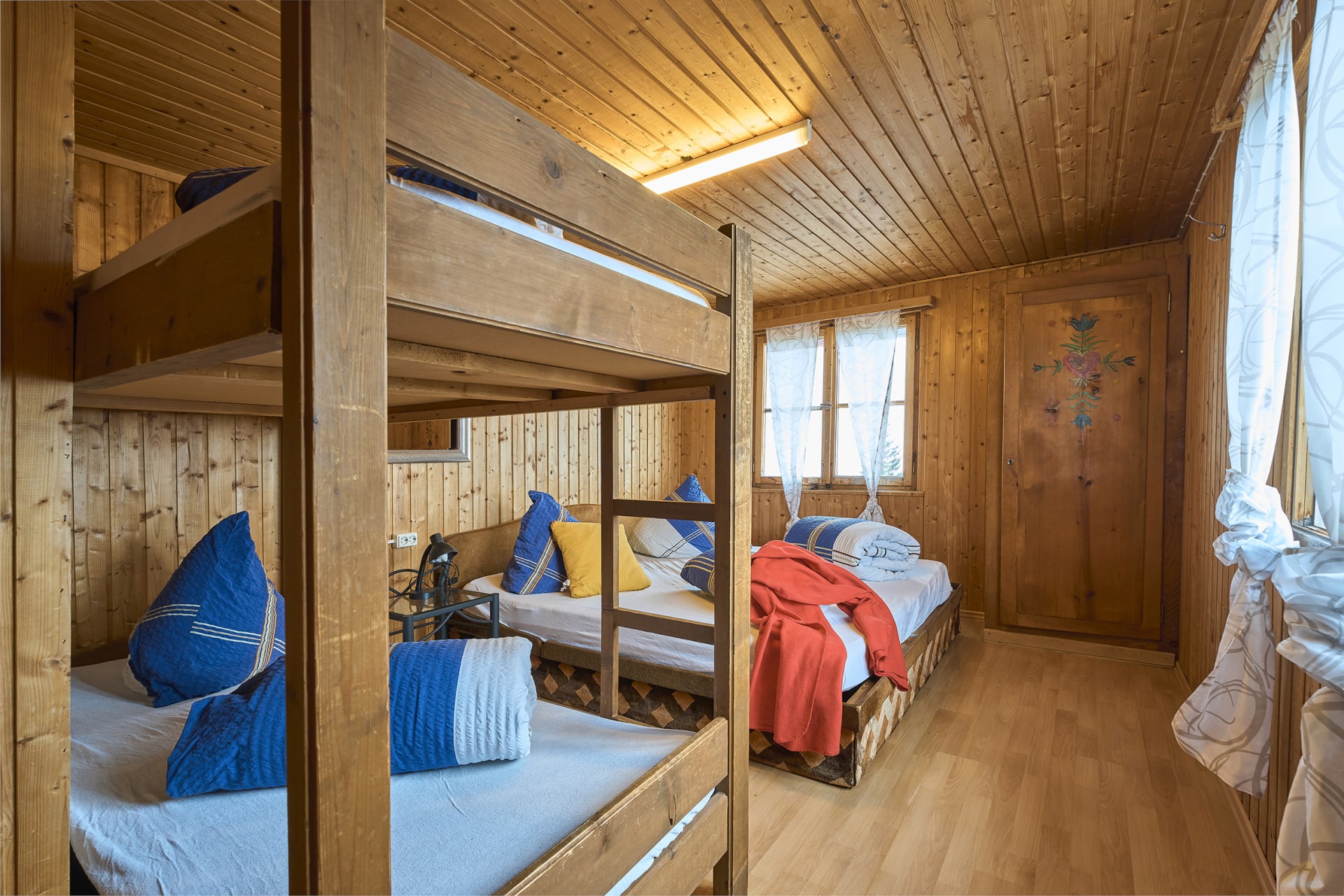 Vierbettzimmer im ersten Stock mit Duschkabine, Doppelbett und 1 Stockbett, WC im Flur, Bergsicht