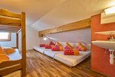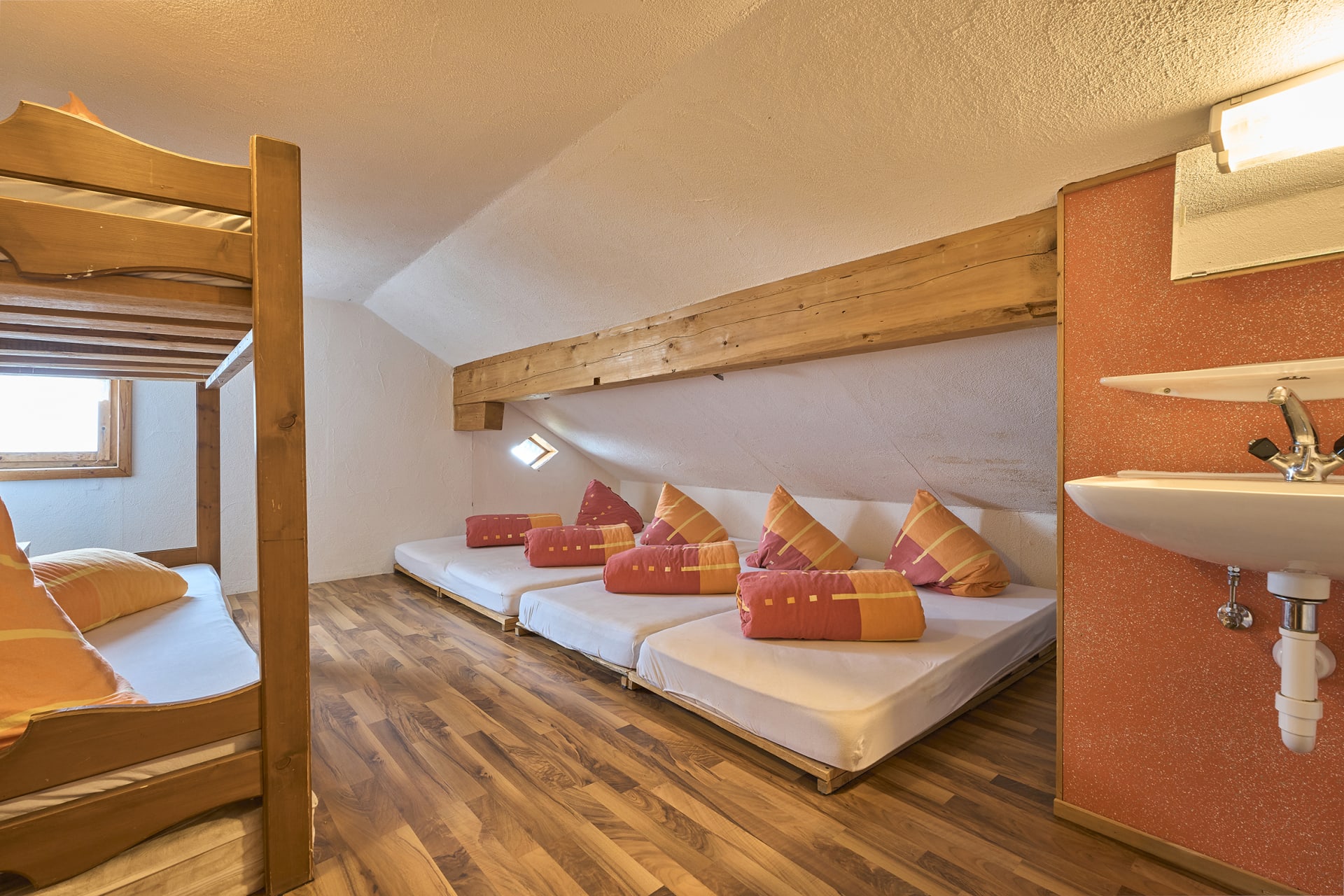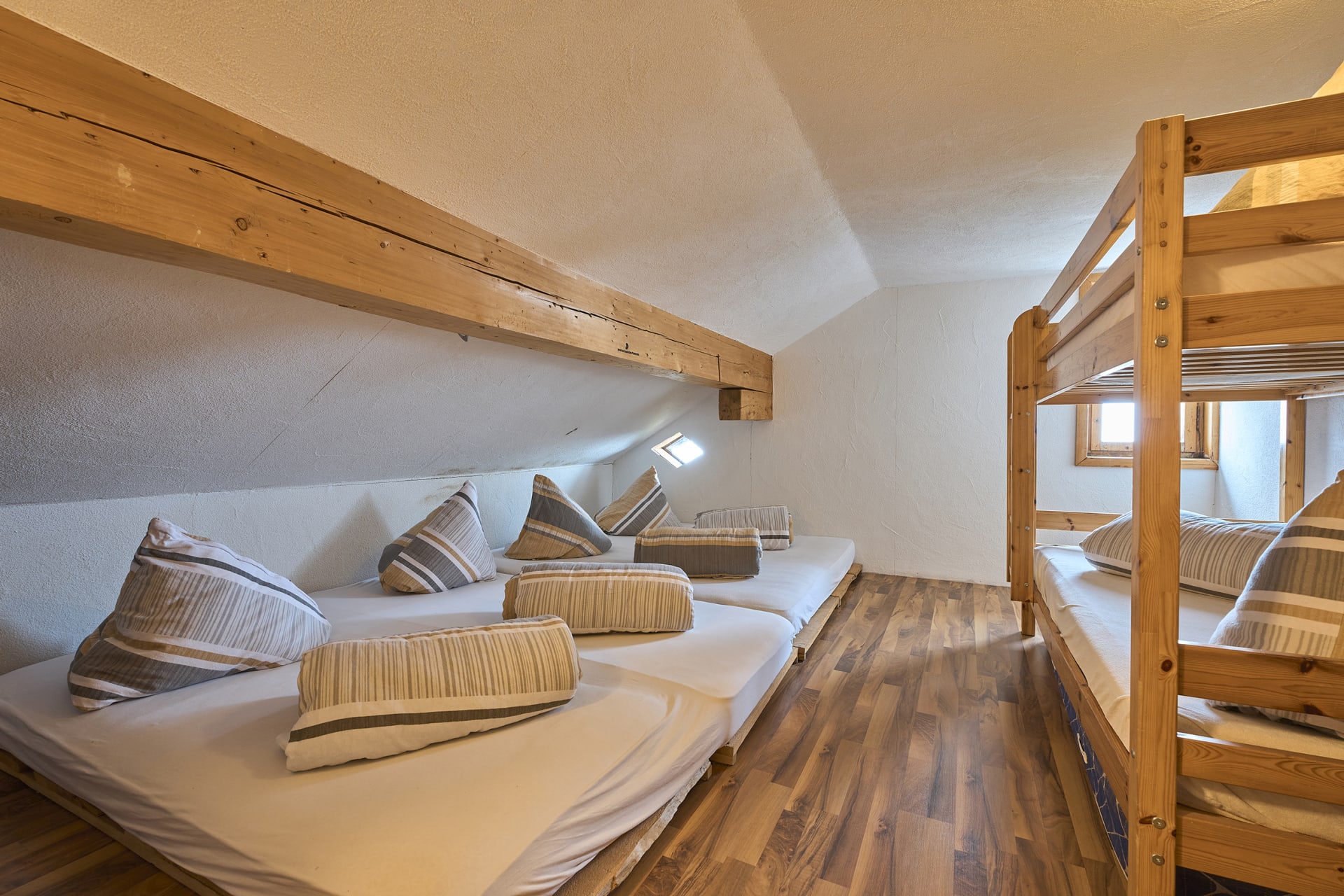 Sechsbettzimmer als Lager im zweiten Stock, ohne Dusche, WC im Flur, Bergblick, Duschmöglichkeit in der Sauna