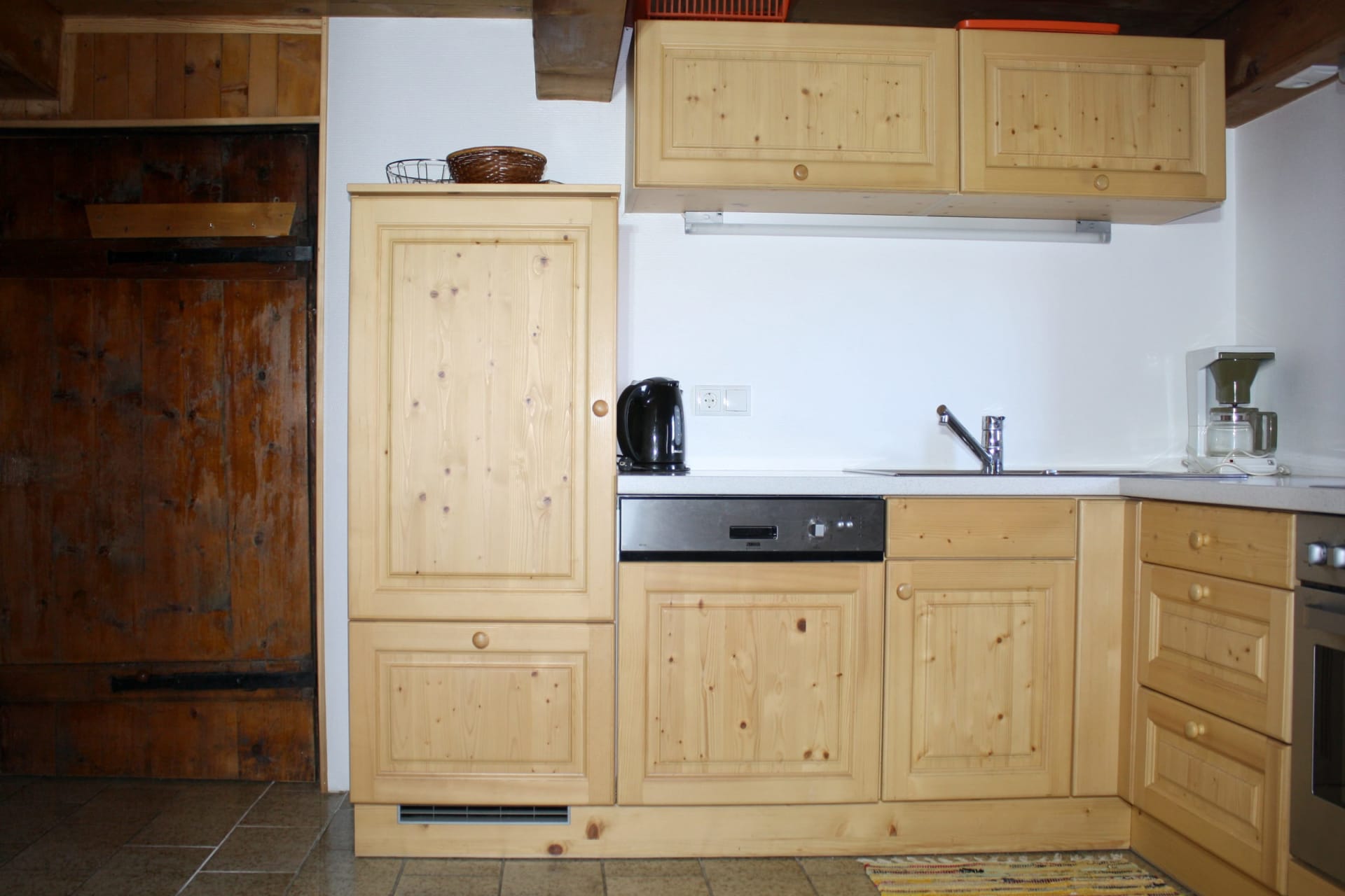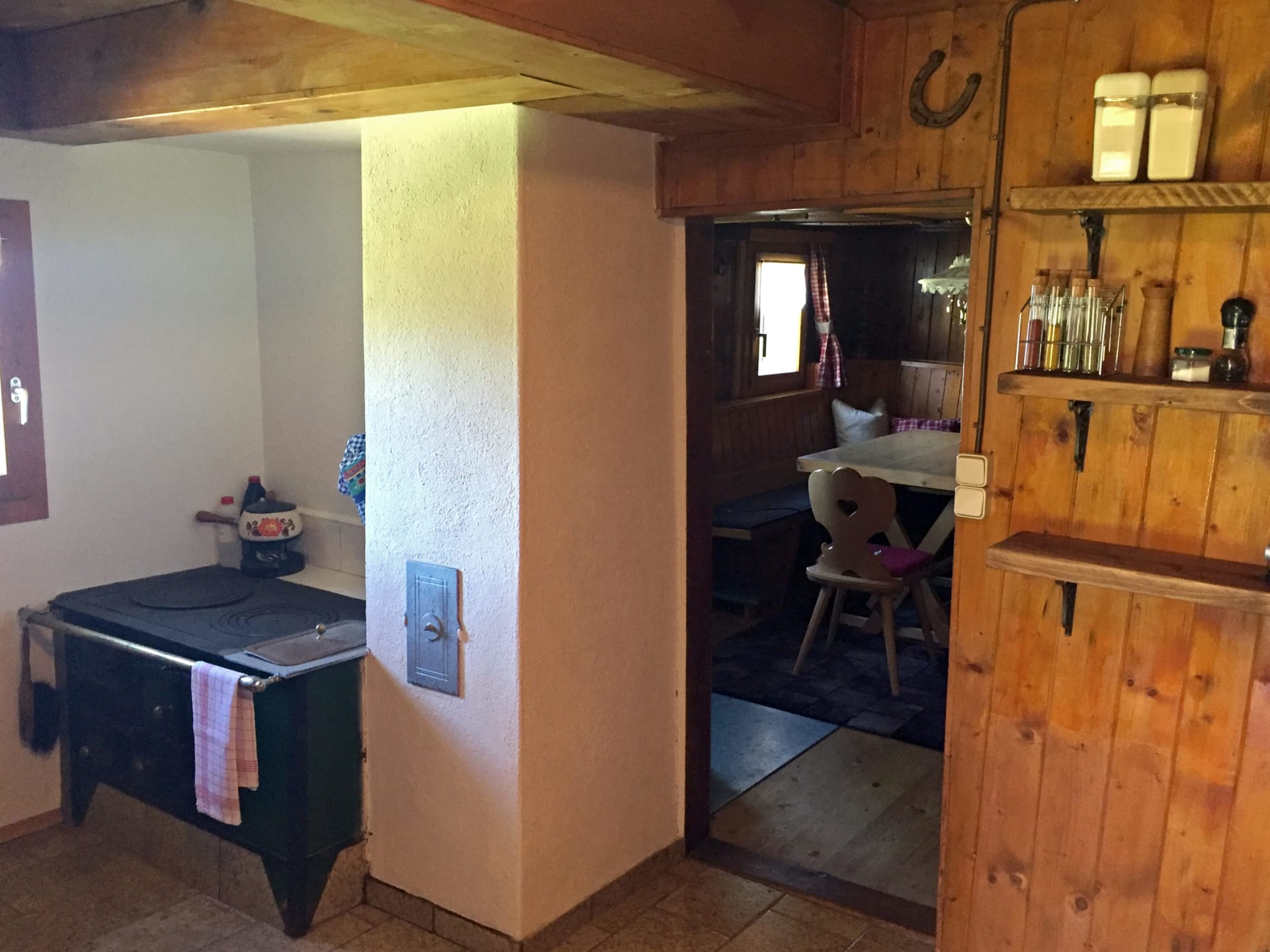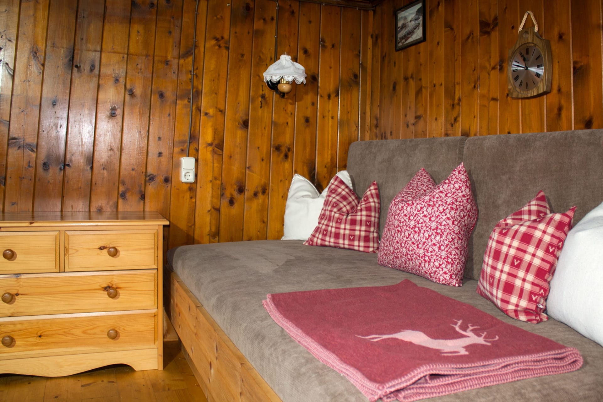 Knarrende Dielenböden, niedrige Raumhöhen, warme Holzwände und ein knisternder Schwedenofen machen die Stube zum perfekten Rückzugsort nach einem erlebnisreichen Tag in den Bergen.