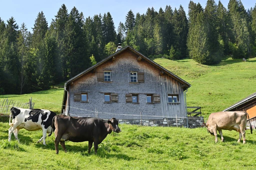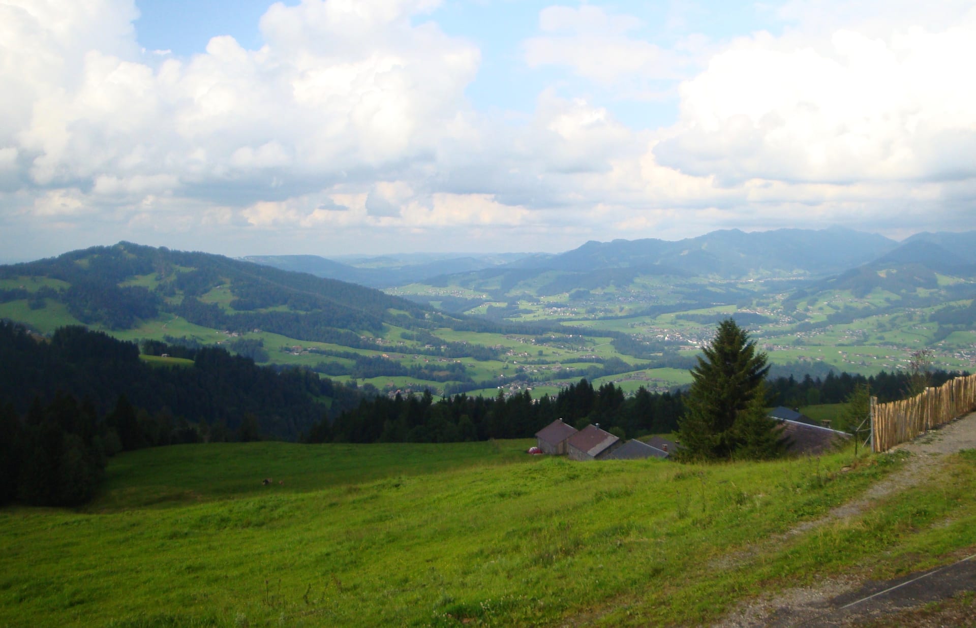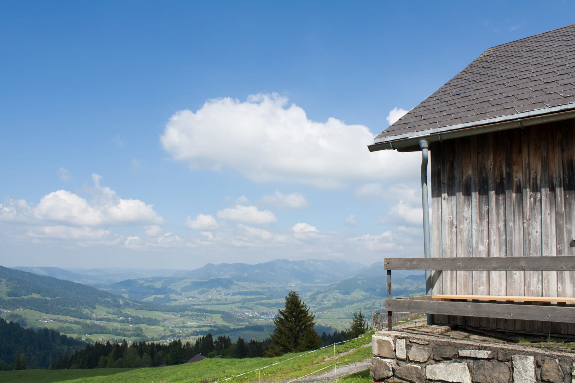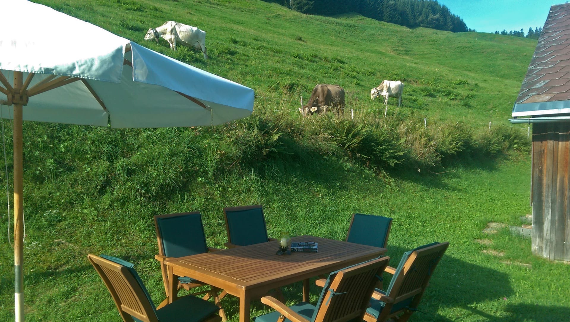 Genießen Sie die Ruhe und Weite der umliegenden Wälder, Wiesen und Gipfel – mit einer traumhaften Aussicht auf die Bergwelt des Bregenzerwaldes.