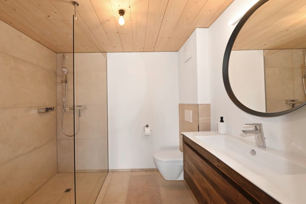 Auf zwei Ebenen befinden sich / eine voll ausgestattete Wohnküche mit Schwedenofen und Kanapee / drei Schlafzimmer mit Doppelbett und Schlafsofa / ein Schlafzimmer mit Doppelbett / drei Bäder mit Dusche und WC / eine Waschmaschine und ein Trockner / ein Aufenthaltsraum / und ein Schopf.