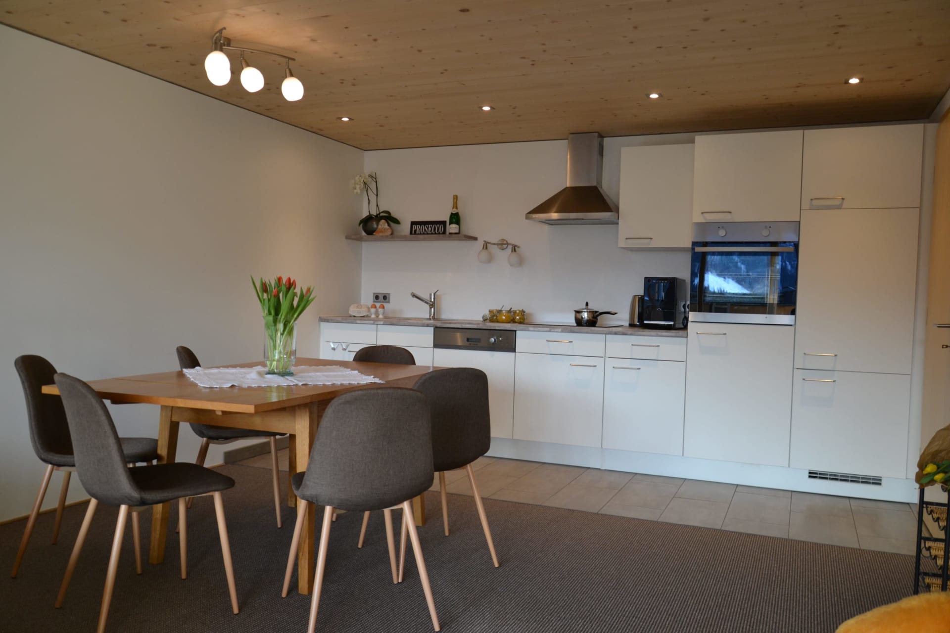 Genießt den herrlichen Panoramablick aus dem zweiten Stock in die Berge. Unser Apartment ist mit drei großen Doppelbett-Schlafzimmern und einer Sauna ausgestattet. Die geräumige Wohnküche inkl. Geschirrspüler und Kaffee-Vollautomat lässt keine Wünsche offen.