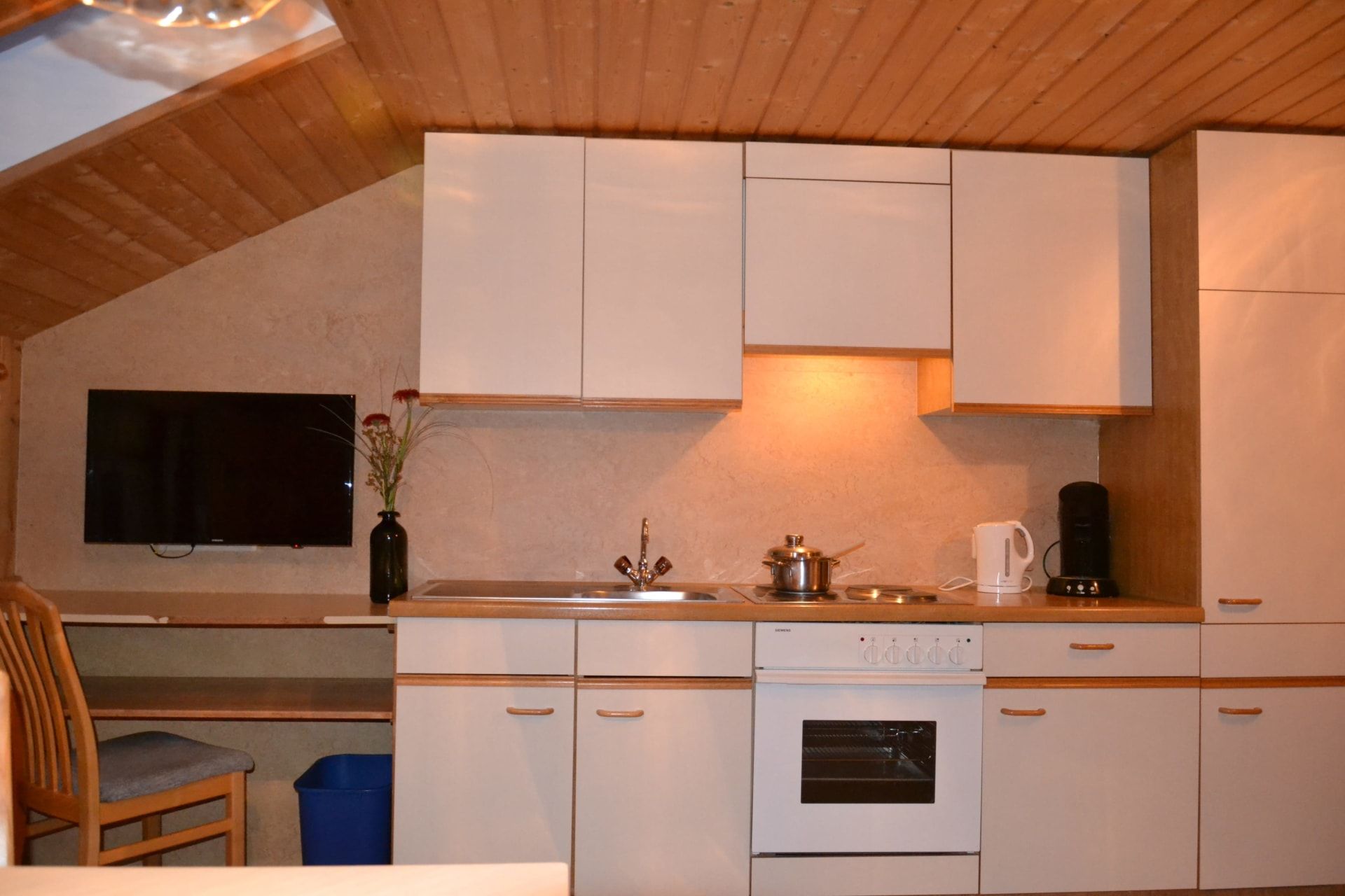 Die große, vollausgestattete Wohnküche inkl. Geschirrspüler und Kaffeemaschine mit Balkon und ausziehbarem Schlaf-Sofa lässt keine Wünsche offen.